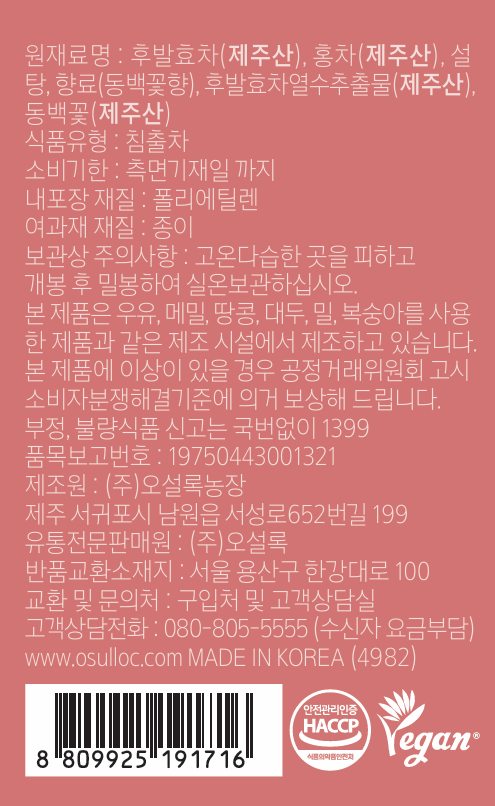 OSULLOC 濟州山茶花茶包,精選濟州島的紅色山茶花,融合熱帶水果的香甜,帶來獨特的味蕾體驗。這款混合茶不僅能溫暖您的身心,更讓您彷彿置身於濟州島的冬日美景中。每一口茶都散發著山茶花的淡雅香氣,以及紅茶的醇厚滋味。獨立茶包設計,方便您隨時隨地沖泡,輕鬆享受一杯充滿幸福感的濟州山茶花茶。讓 OSULLOC 濟州山茶花茶,為您的生活增添一抹甜蜜與溫暖。