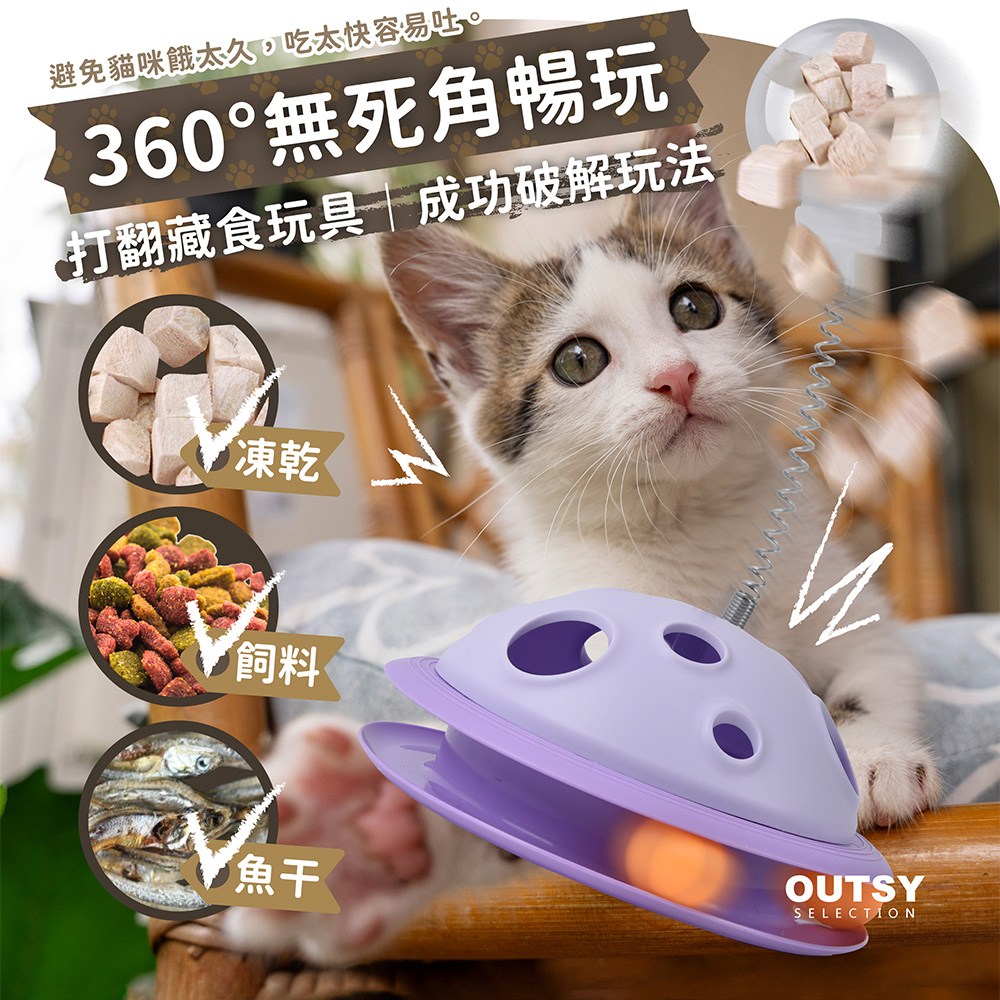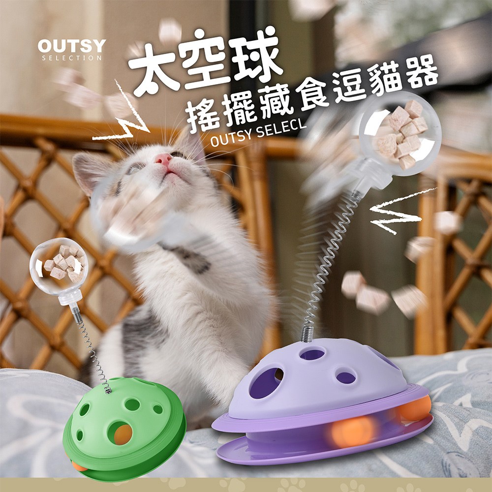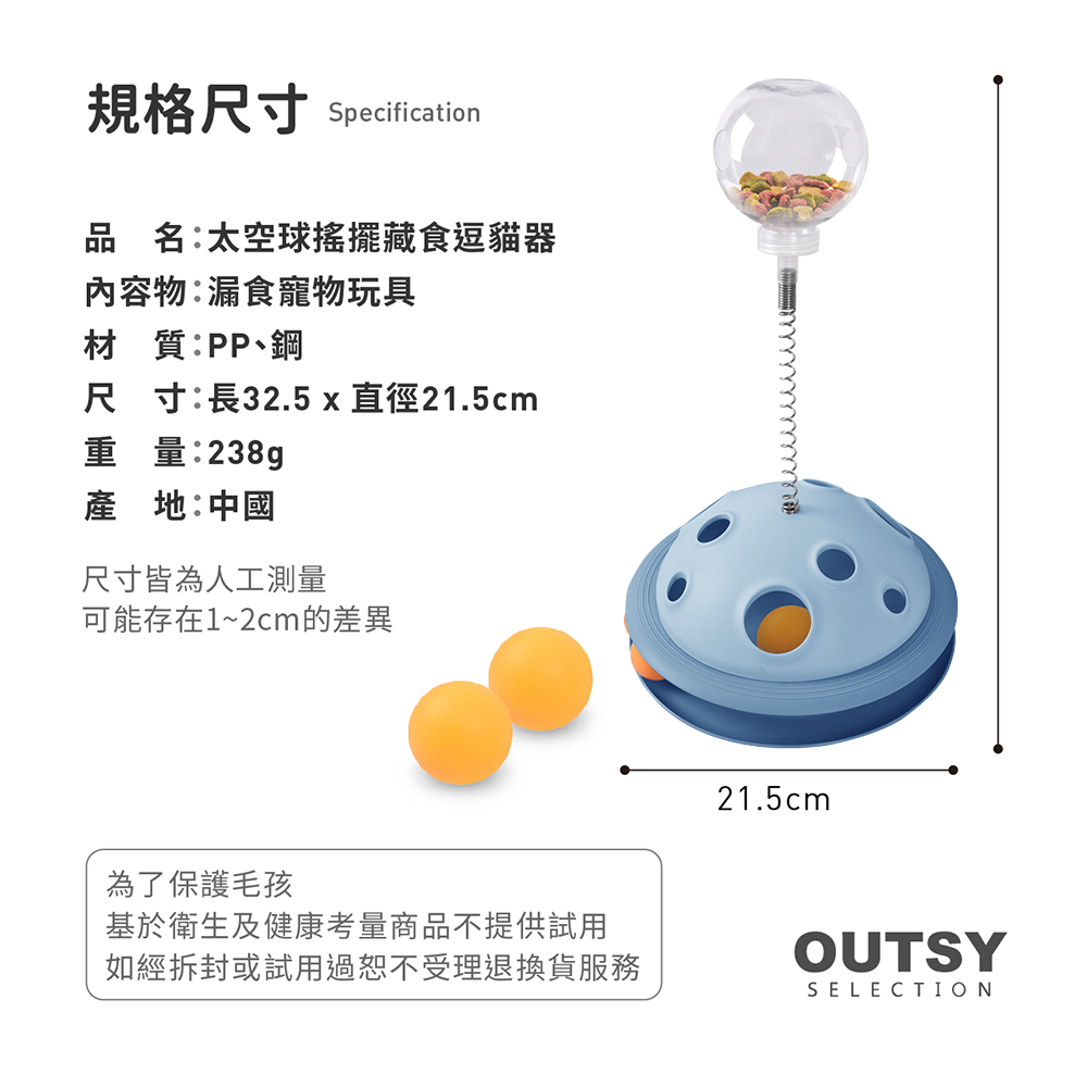 OUTSY太空球搖擺藏食逗貓器是一款結合玩樂與餵食功能的寵物玩具。獨特的太空球造型設計,模擬貓咪的狩獵場景,激發牠們的玩耍天性。搖擺設計增加了遊戲的挑戰性,讓貓咪在玩耍中鍛鍊身體,保持活力。藏食功能可以延長貓咪的進食時間,有助於消化,避免狼吞虎嚥。天藍色的外觀清新可愛,為家居增添一抹色彩,同時吸引貓咪的注意力,讓牠們愛不釋手。