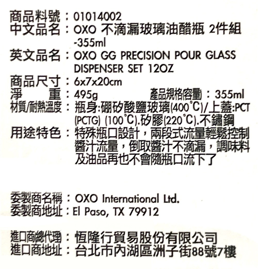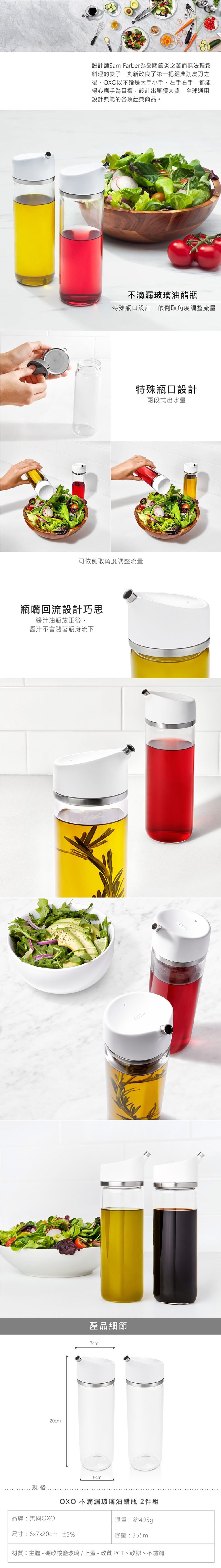OXO不滴漏玻璃油醋瓶,為您的廚房帶來優雅與便利。這款油醋瓶採用優質玻璃瓶身,搭配不滴漏瓶蓋設計,讓您輕鬆控制油量,告別滴漏困擾。355ml的容量,適合存放各式油品、醋、醬油等調味料。瓶身耐熱玻璃材質,可安心使用。簡約時尚的外觀,為您的餐桌增添品味。一組包含兩個油醋瓶,滿足您多樣的調味需求。