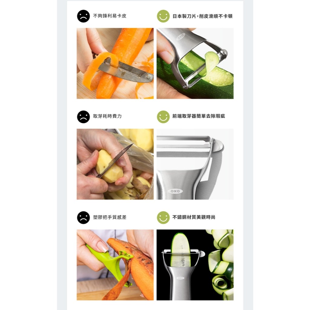 OXO不鏽鋼Y型蔬果削皮器,採用高品質不鏽鋼打造,堅固耐用且易於清潔。Y型設計符合人體工學,握感舒適,削皮時更加穩定順暢。鋒利的刀片能輕鬆去除蔬果外皮,前端的特殊設計還能方便地去除芽眼。無論是削蘋果、馬鈴薯還是紅蘿蔔,都能輕鬆應對,是廚房裡不可或缺的好幫手。此外,不鏽鋼材質美觀時尚,為您的廚房增添質感。