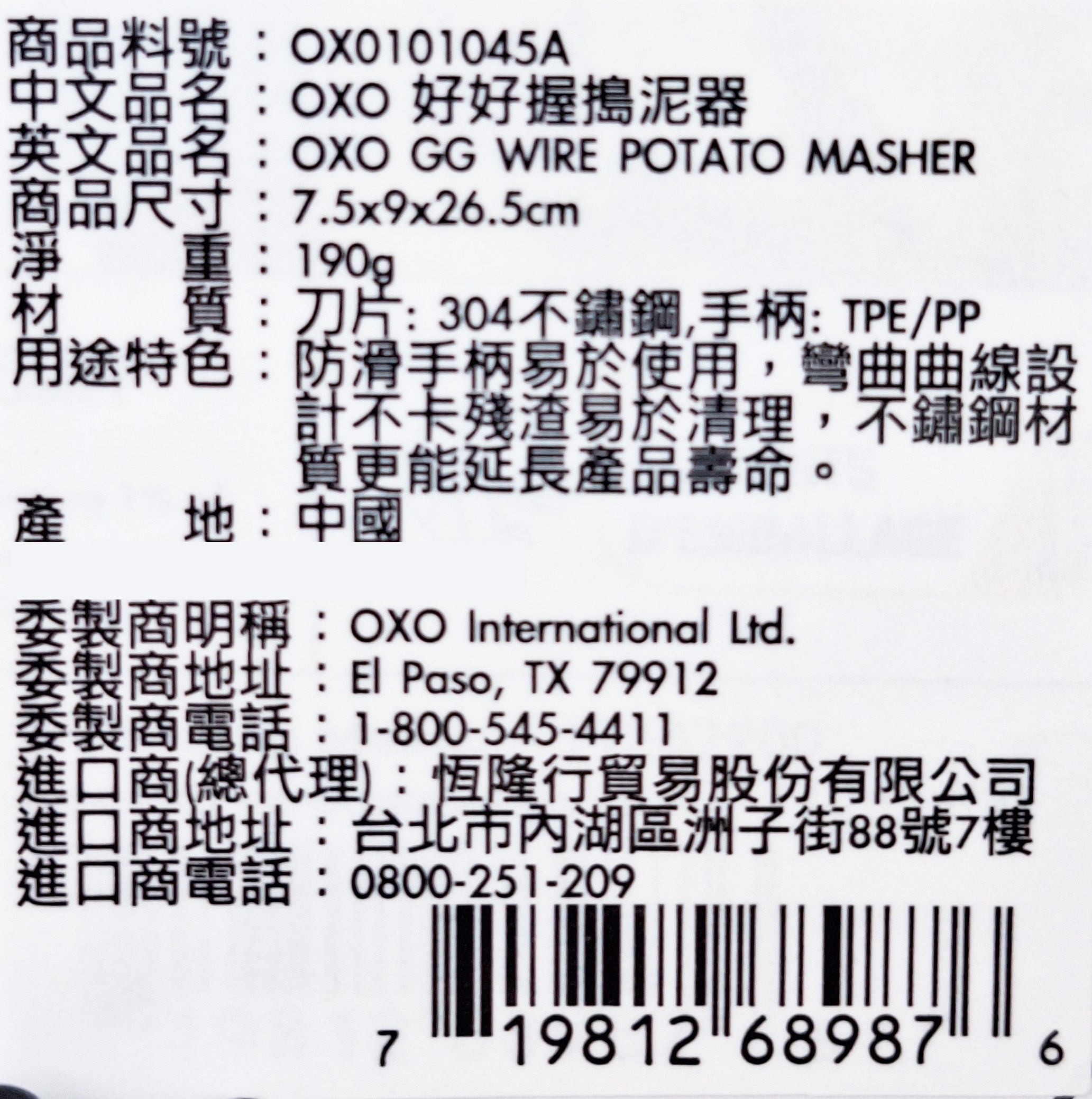 OXO 好好握搗泥器是您廚房中不可或缺的好幫手。採用耐用的304不鏽鋼刀片,確保安全衛生,讓您安心使用。符合人體工學的TPE/PP防滑手柄,提供舒適的握感,即使長時間使用也不易疲勞。獨特的彎曲曲線設計,不易卡殘渣,清潔更方便,延長產品壽命。尺寸為26.5 x 7.5 x 9公分,重量僅190克,輕巧易收納。無論是製作綿密的馬鈴薯泥,還是搗碎其他食材,OXO 搗泥器都能輕鬆勝任,讓您享受烹飪的樂趣。