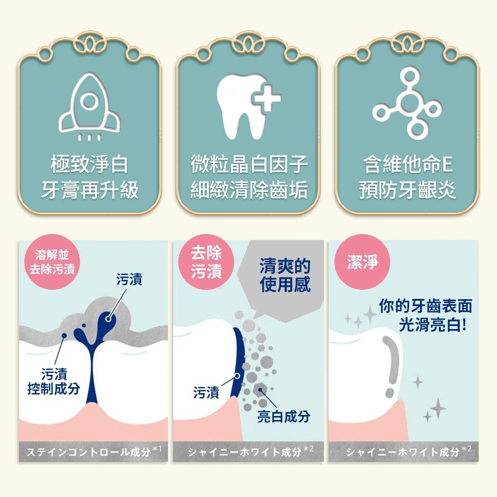 - 極緻淨白配方,溫和清潔口腔,不傷琺瑯質,每日使用保持牙齒健康。