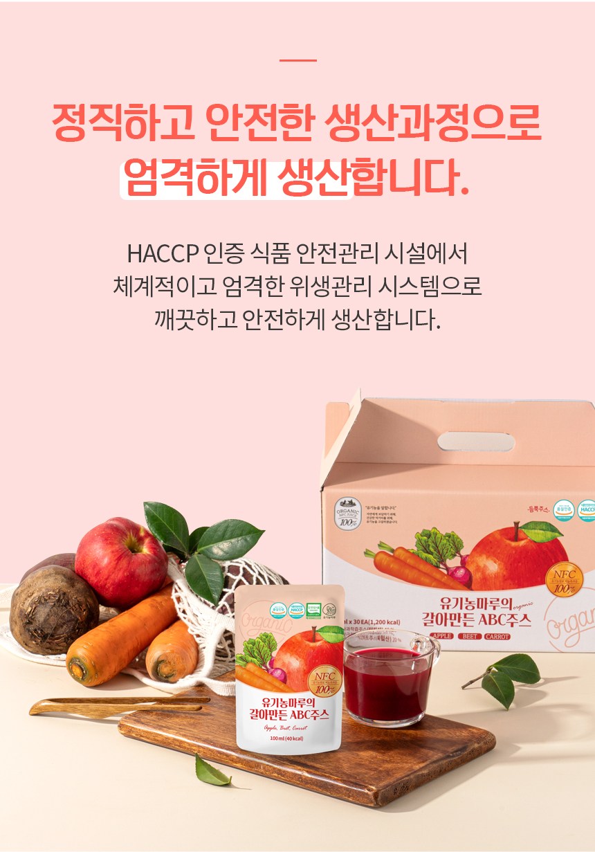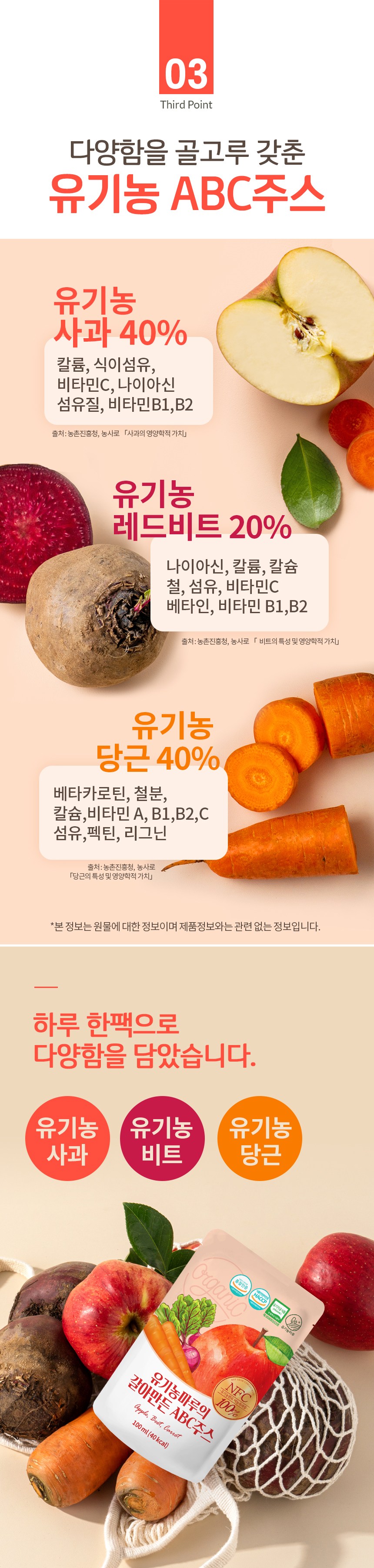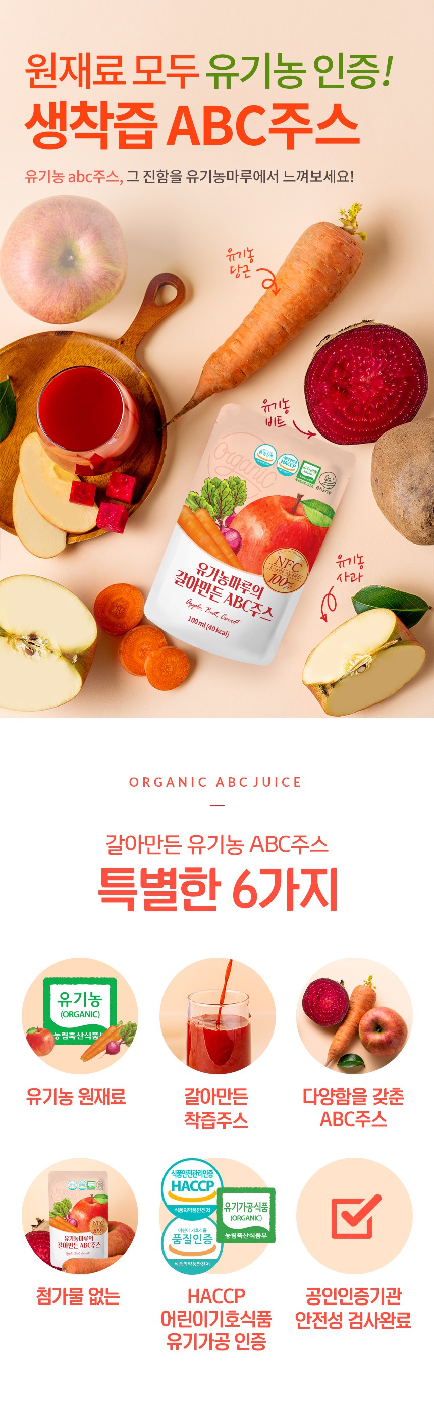 Organicmaru ABC蔬果汁隨身包,嚴選優質蘋果、甜菜根與胡蘿蔔,以完美比例調配而成。這款蔬果汁不添加任何人工色素、香料或防腐劑,保留了蔬果最原始的風味與營養。採用隨身包設計,方便您隨時隨地補充所需營養,維持健康活力。每日一包,讓您輕鬆享受健康美味,為您的生活增添更多色彩。適合全家大小一同飲用,是您健康生活的好夥伴。