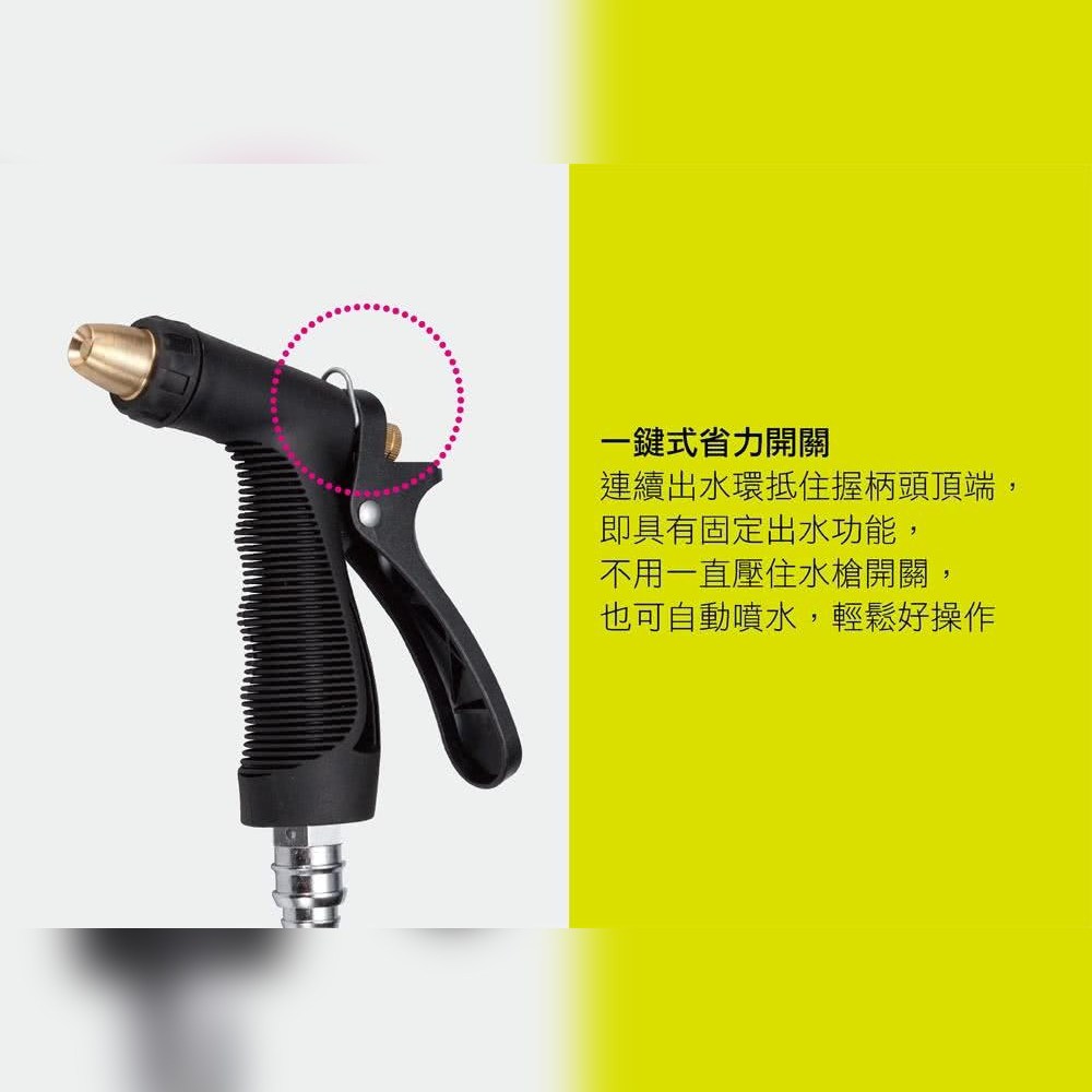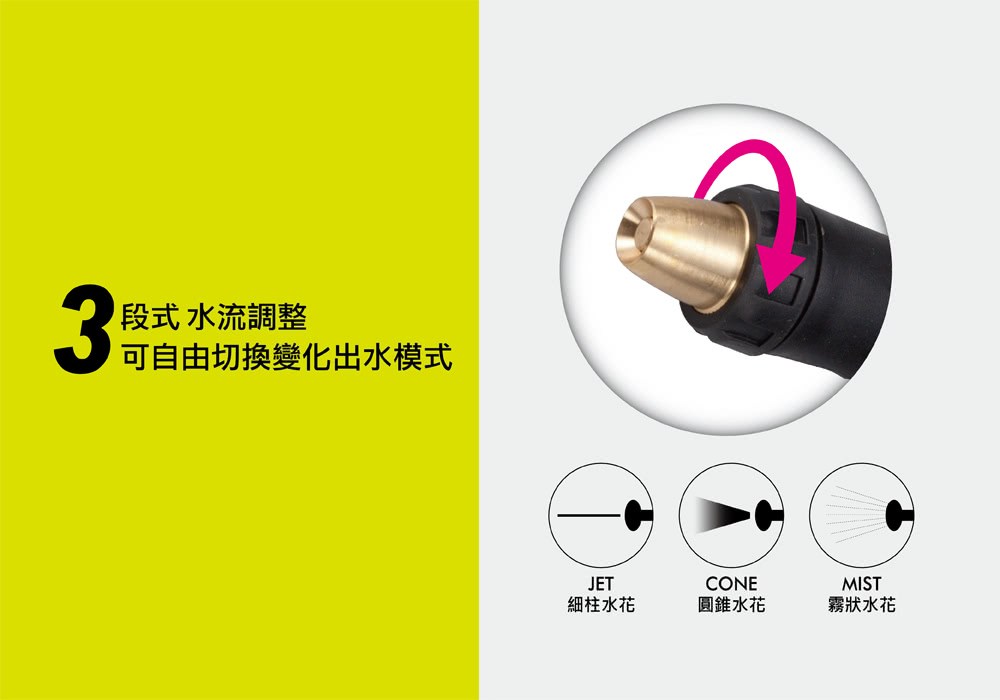 - 可調式噴水模式,從強力沖洗到柔和灑水,滿足洗車、園藝、居家清潔等多種用途,使用非常方便。