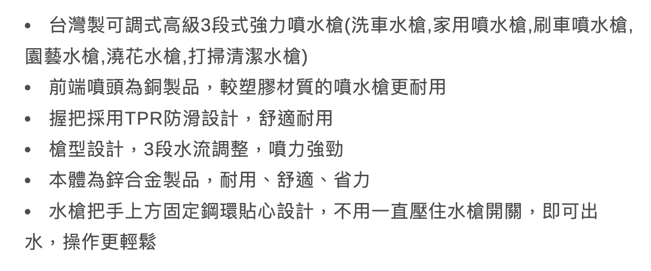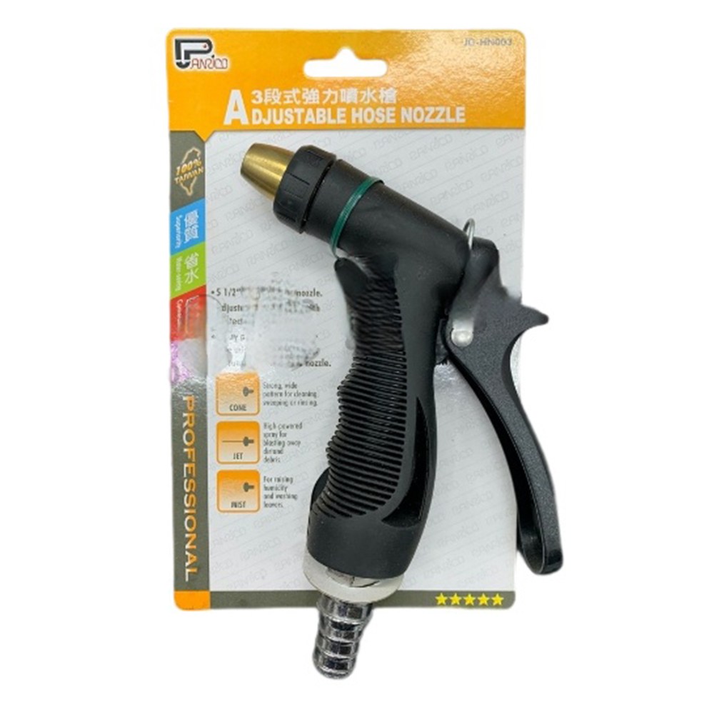 這款Panrico百利世可調式高級3段強力噴水槍,是您清潔和園藝的理想選擇。台灣製造,品質保證,噴水槍本體為鋅合金材質,堅固耐用。前端噴頭為銅製品,較塑膠材質的噴水槍更耐用,握把採用TPR防滑設計,舒適耐用。槍型設計,3段水流調整,噴力強勁,可根據不同需求調整水流模式,輕鬆應對各種清潔任務。水槍把手上方固定鋼環貼心設計,不用一直壓住水槍開關,即可出水,操作更輕鬆。