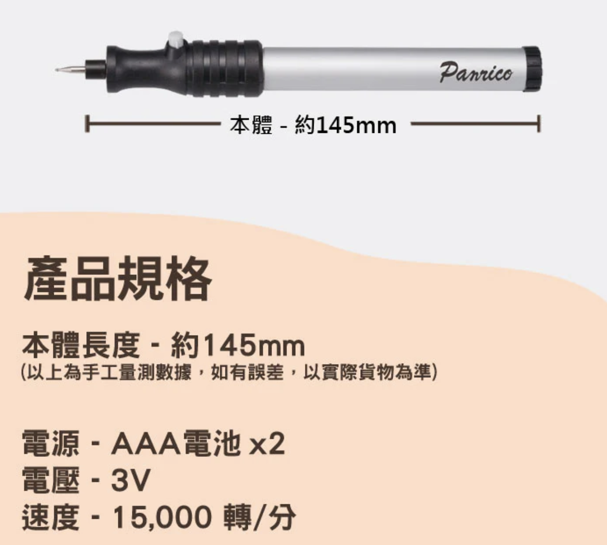 Panrico 百利世台灣製造電動雕刻筆,採用電池式設計,輕巧便攜,讓您隨時隨地都能進行創作。這款刻字筆適用於多種材質,如玻璃、陶瓷、金屬、木材等,能滿足您不同的雕刻需求。筆身符合人體工學設計,握感舒適,操作簡單,即使是初學者也能輕鬆上手。台灣製造,品質保證,讓您買得安心,用得放心。無論是DIY愛好者還是專業工匠,這款電動雕刻筆都是您不可或缺的好幫手。
