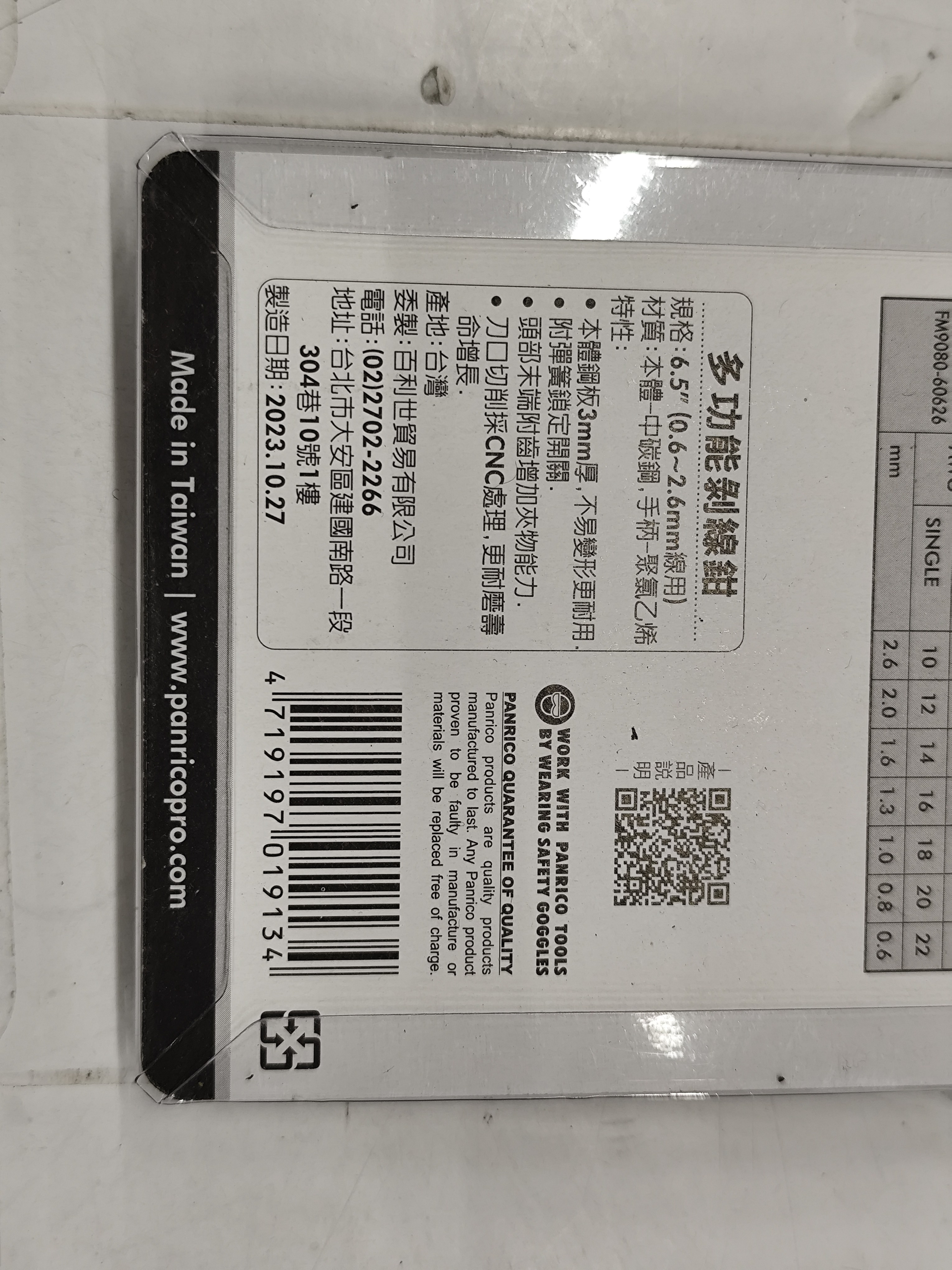 Panrico百利世多功能剝線鉗是您進行電線處理的理想選擇。這款6.5吋的剝線鉗適用於0.6~2.6mm的電線,能精確剝除電線外皮而不損傷內部導體,確保電線連接的可靠性。鉗身採用堅固耐用的鋼材製成,手柄則使用舒適的聚丙烯材質,提供穩固的握持感,即使長時間使用也不易疲勞。無論是專業電工還是DIY愛好者,都能輕鬆上手,提高工作效率。Panrico百利世以其高品質和耐用性著稱,是您值得信賴的工具品牌。