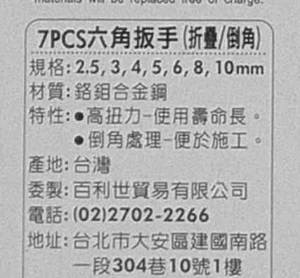 - 百利世折疊六角扳手,一套七件,輕鬆應對不同尺寸需求,方便快捷。