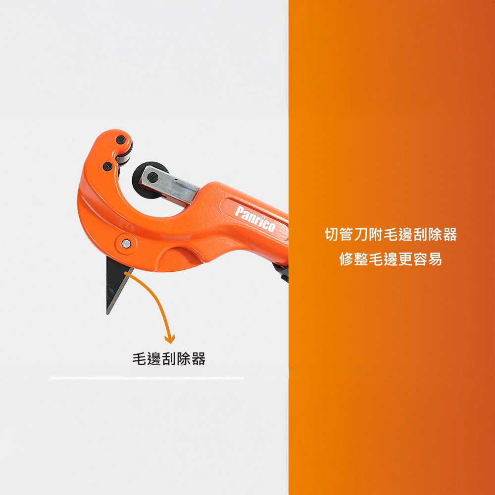 - 內建毛邊刮除器,讓切割後的管子邊緣平滑,使用起來更加安全。