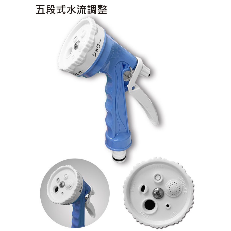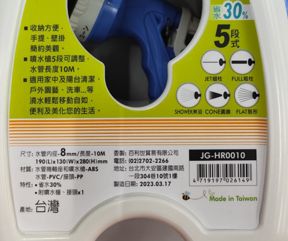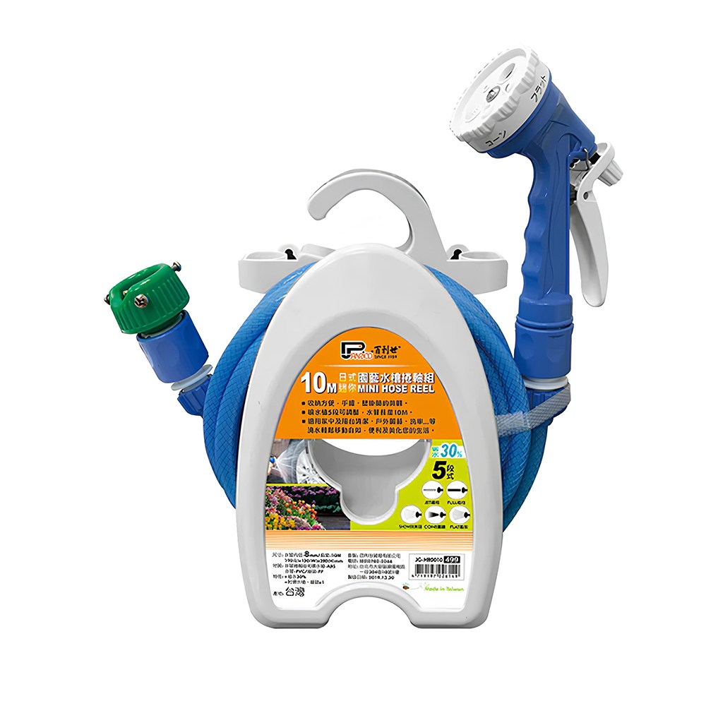 - 10米長水管搭配五段式噴水槍,滿足各種澆水需求,使用更靈活。