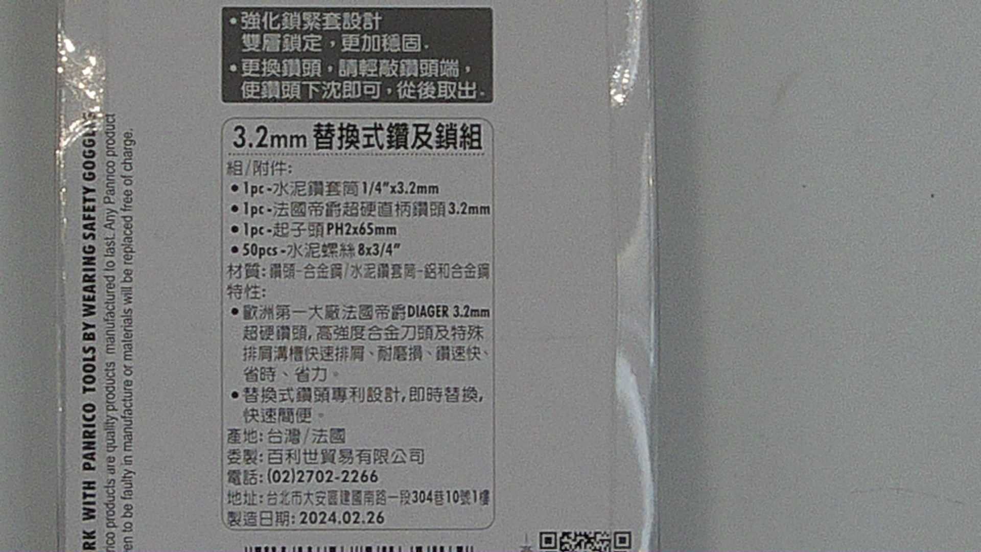 Panrico 百利世 替換式1分鑽兼鎖組 3.2MM,是您進行水泥牆面鑽孔和鎖螺絲的理想選擇。此套組包含一個3.2mm的法國帝爵超硬鑽頭,能夠快速且精準地在水泥牆上鑽孔。此外,還配有一個起子頭和50個水泥螺絲,方便您進行鎖螺絲作業。替換式鑽頭設計讓您能夠快速更換鑽頭,節省時間和精力。無論是DIY愛好者還是專業人士,這款鑽兼鎖組都能滿足您的需求,讓您的工作更加高效便捷。