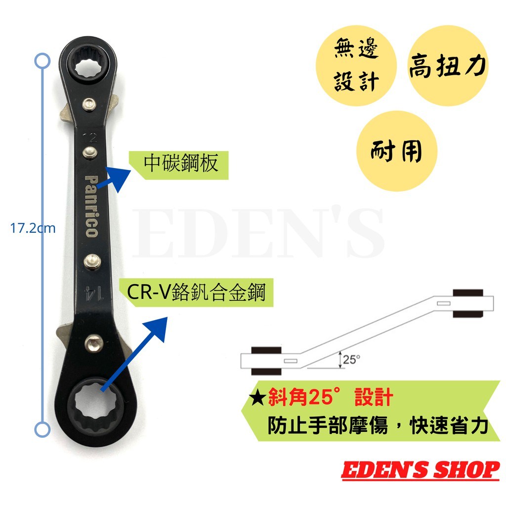 Panrico 百利世 無邊棘輪梅花扳手,採用12 x 14mm雙頭設計,一支即可滿足多種尺寸需求。棘輪設計讓您在狹小空間也能輕鬆操作,無需反覆調整扳手位置,提升工作效率。本體採用中碳鋼板,堅固耐用,棘輪部分則使用鉻釩合金鋼,提供高扭力及耐磨損特性。25°傾斜角設計,讓您使用更舒適省力。台灣製造,品質保證,是您專業工具箱中不可或缺的好幫手。