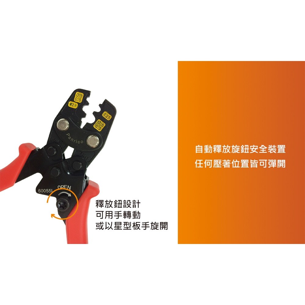 Panrico 百利世雙棘輪省力端子鉗是您進行電線端子壓接的理想選擇。這款端子鉗採用雙棘輪傳動設計,能有效節省工作力氣,讓您輕鬆完成壓接任務。適用於0.3~5.5mm範圍的端子,滿足多種規格需求。鉗頭採用鉻釩合金鋼材質,堅固耐用,手柄則採用TPR+高碳鋼,握感舒適,防滑耐磨。此外,它還具有自動釋放旋鈕安全裝置,可在任何壓著位置彈開,確保使用安全。無論是專業電工還是DIY愛好者,都能輕鬆上手,提高工作效率。