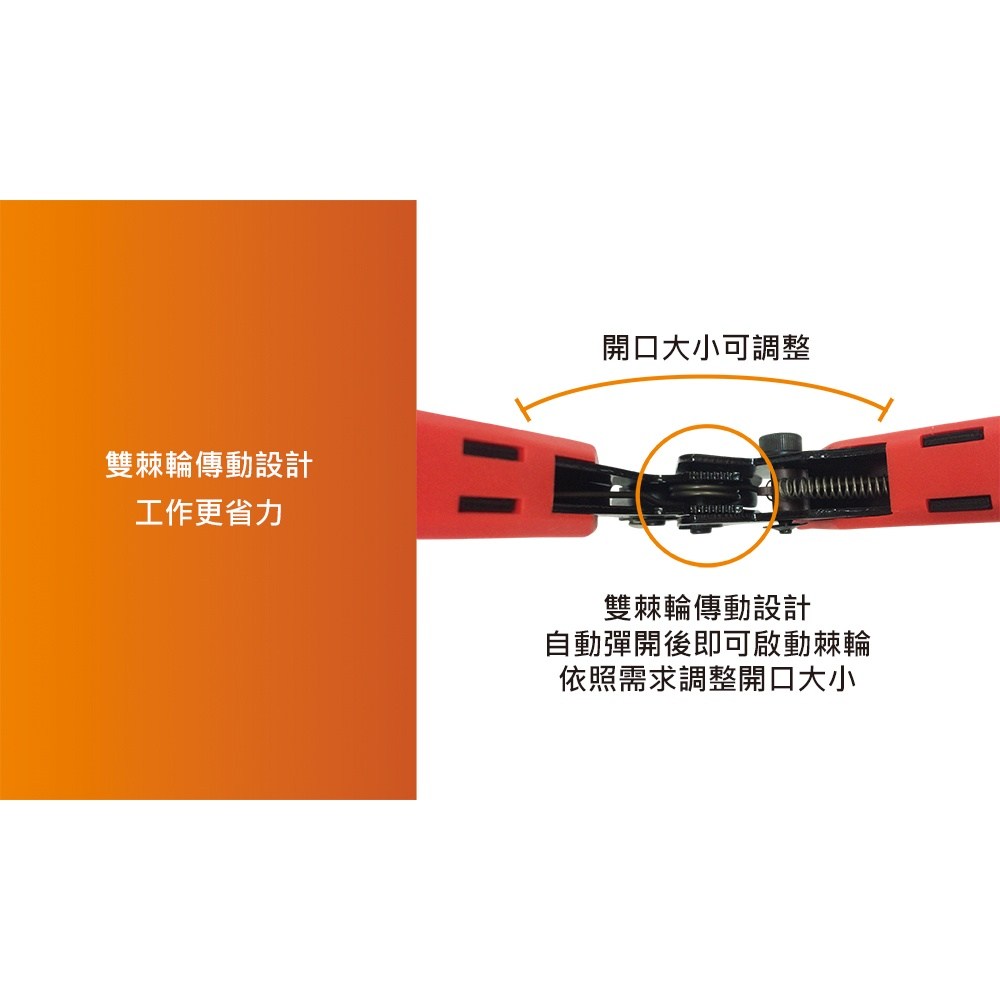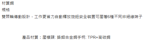 - 雙棘輪設計,操作更省力,讓您輕鬆完成端子壓接工作,提升工作效率。