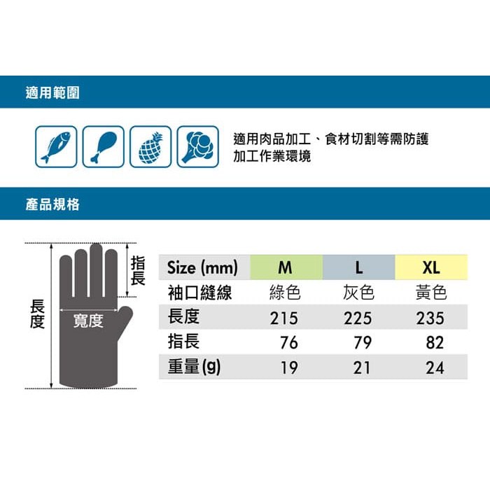 Panrico 百利世食品級A5級防割手套。採用金屬絲編織的A5級防割材質,讓您安心處理食材。這款手套不僅通過了食品級認證,確保與食物接觸的安全,還具有極佳的舒適度和靈敏度,讓您在操作時依然靈活自如。無論是處理肉類、蔬果,還是進行精細的廚房工作,Panrico防割手套都能提供可靠的保護,是廚房愛好者和專業廚師的理想選擇。M碼設計,一雙入,為您的雙手提供周全的呵護。