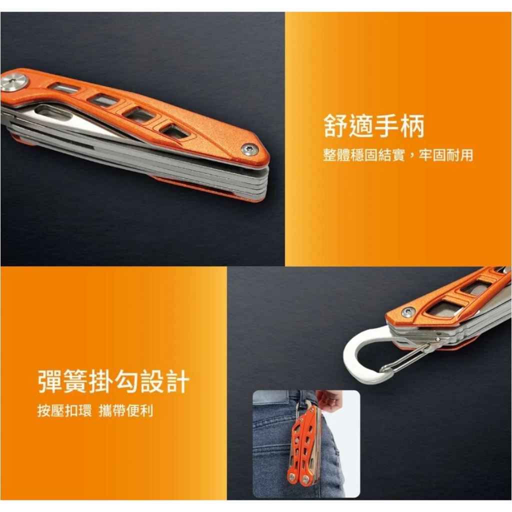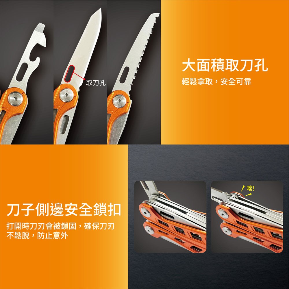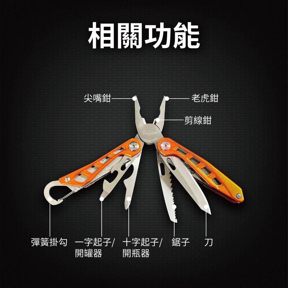 - 折疊工具鉗設計精巧,收納方便不佔空間,附彈簧設計,單手操作也很順暢。