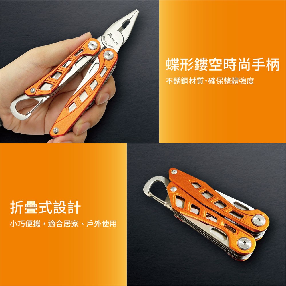 這款Panrico百利世10合1多功能折疊工具鉗,是您居家、汽車維修、露營和登山等各種場合的理想選擇。它結合了尖嘴鉗、老虎鉗、剪線鉗、折疊刀、迷你鋸、十字起子/開瓶器、一字起子/開罐器和彈簧掛鉤等多種功能,一鉗在手,應有盡有。收合尺寸僅107mm,展開尺寸為175mm,方便攜帶,隨時應對各種需求。採用不鏽鋼材質,堅固耐用,讓您使用更安心。無論是日常維修還是戶外探險,這款多功能工具鉗都能成為您的得力助手。
