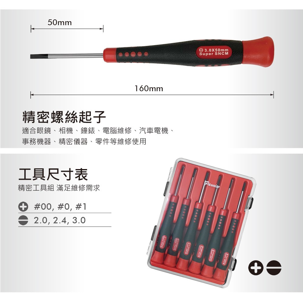 PANRICO 百利世 6件式精密螺絲起子組,是您進行精細維修工作的理想選擇。這款螺絲起子組包含Phillips和一字兩種驅動系統,適用於眼鏡、相機、電腦等精密儀器。採用鉻釩鋼材質,扭力特強且耐用,確保每次使用都能提供穩定的性能。符合人體工學的握柄設計,提供舒適的握感,即使長時間使用也不易疲勞。此外,頭部旋式設計讓您在狹小空間也能輕鬆操作,大幅提升工作效率。無論是專業維修人員還是DIY愛好者,這款精密螺絲起子組都能滿足您的需求。