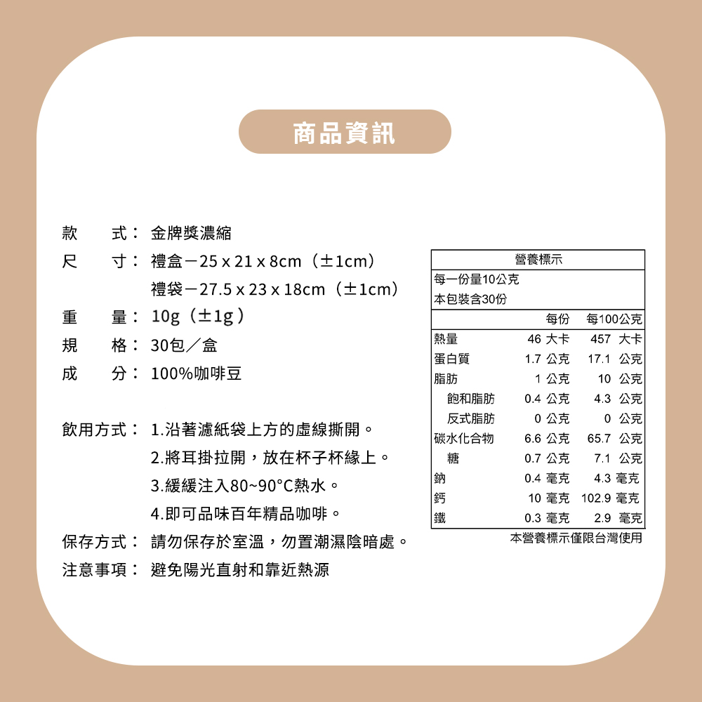 - - 濾掛式設計方便快捷,無需複雜工具,隨時隨地享受一杯香醇濃郁的義式濃縮咖啡,輕鬆又省時。