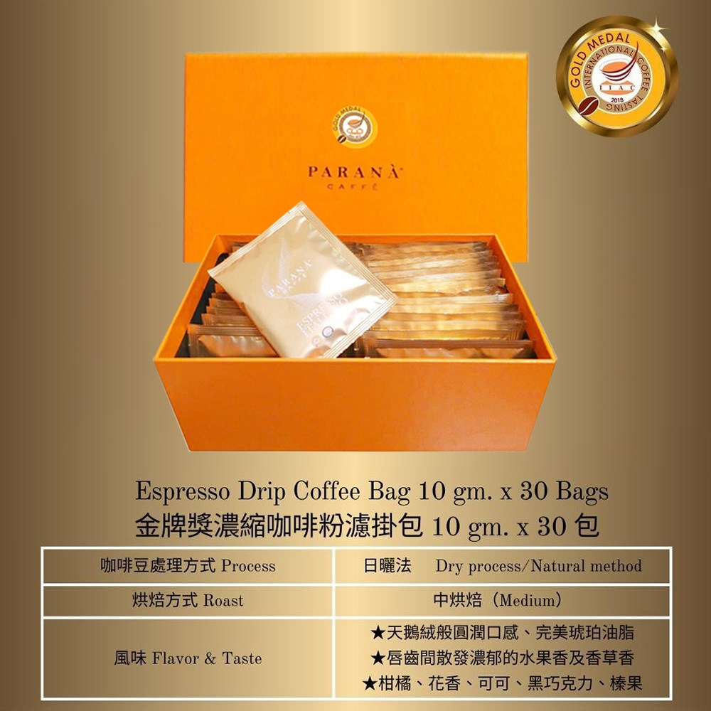 PARANA 金牌咖啡 濃縮咖啡濾掛包 Set IIAC國際金牌獎 歐洲國家級咖啡認證 精品禮盒附提袋, 1盒, 10g, 30包
