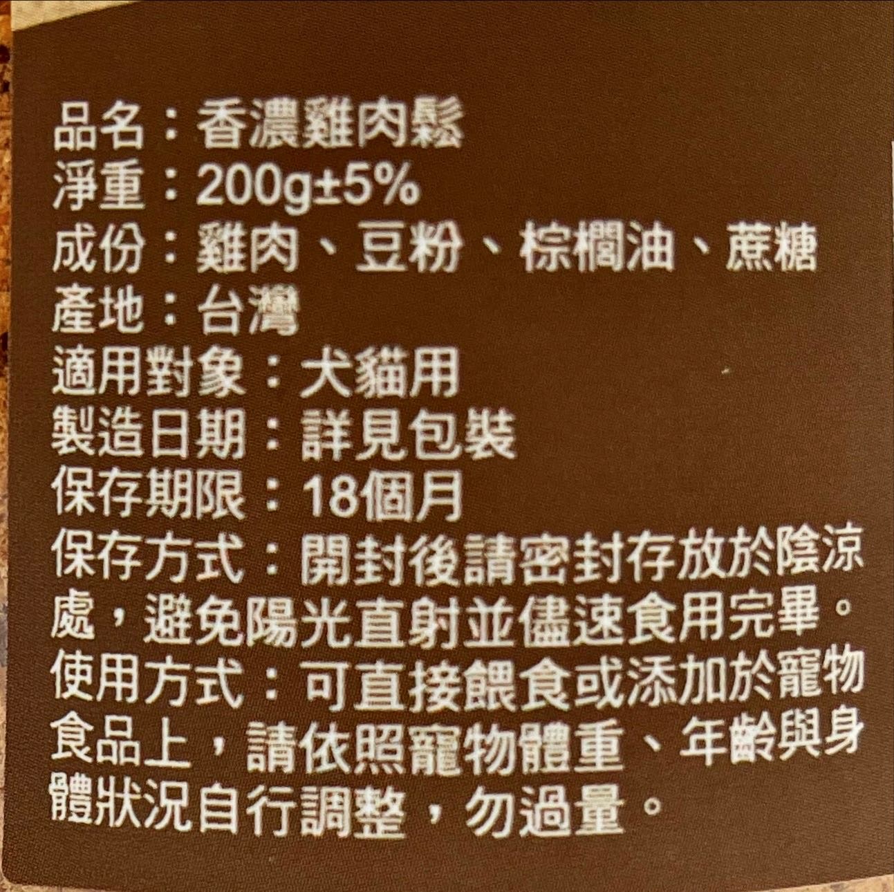 - 雞肉鬆的香濃滋味,能有效提升寵物的食慾,讓牠們開心享用每一餐,健康成長。
