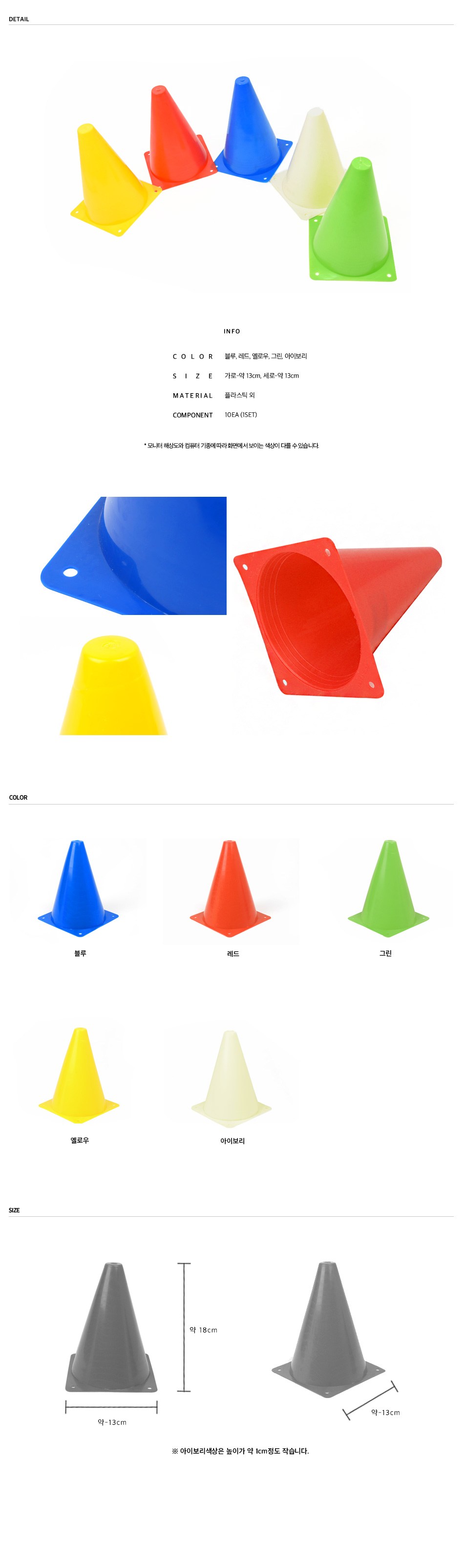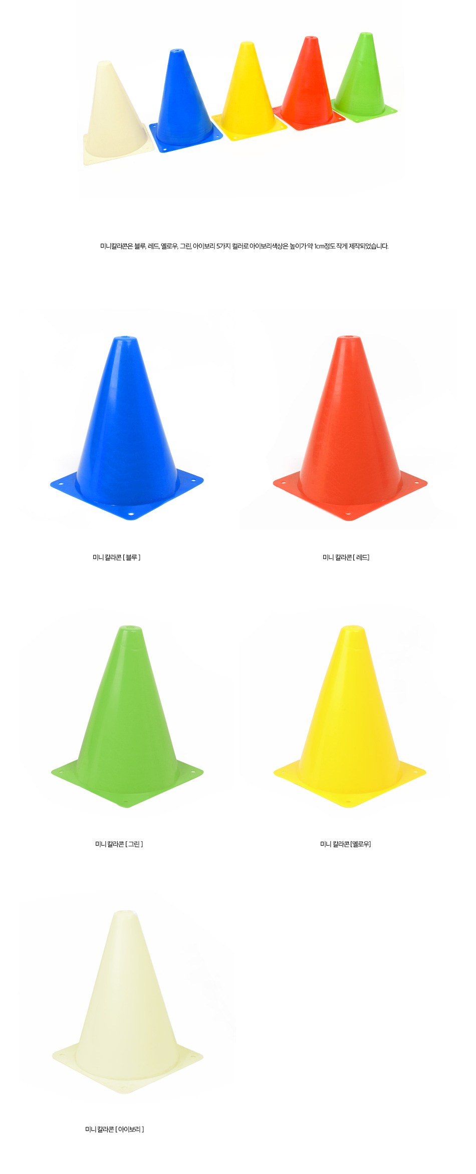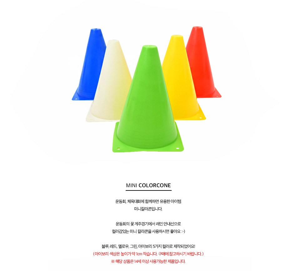 迷你彩色錐組是運動會和體育活動的實用工具,可用於標記賽道或設置訓練區域。這組色錐包含藍色、紅色、黃色、綠色和象牙白五種顏色,色彩鮮豔,易於辨識。迷你色錐輕巧易攜帶,方便在不同場地使用。它們由耐用的塑膠製成,適合重複使用,是運動訓練和趣味遊戲的理想選擇。請注意,象牙白色的高度略小約1公分。
