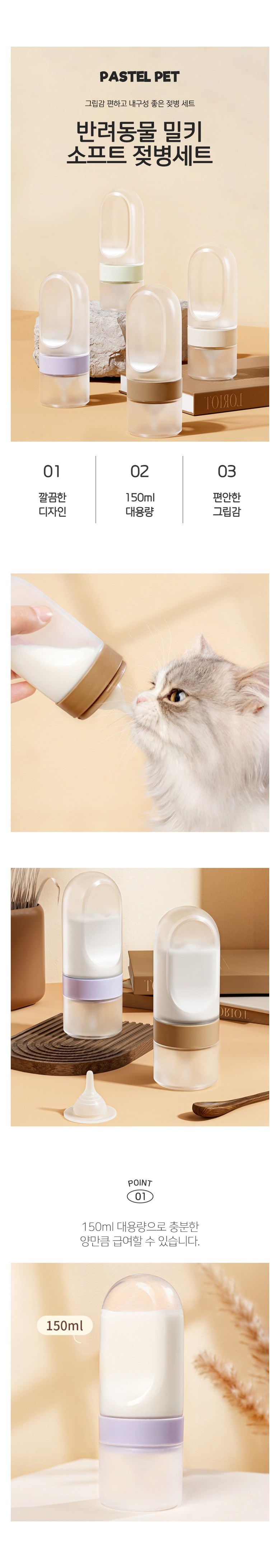 PASTEL PET寵物牛奶軟奶瓶套組,為您提供簡潔、舒適的餵食體驗。150ml大容量設計,滿足寵物一次的餵食需求。奶瓶易於握持,方便您輕鬆控制餵食。套組包含奶瓶、清洗刷、通針和兩個奶嘴,方便清潔和更換。耐高溫材質,可用熱水消毒,確保寵物飲食衛生。象牙白、綠色、紫色、棕色多種顏色可選,滿足您的個性化需求。