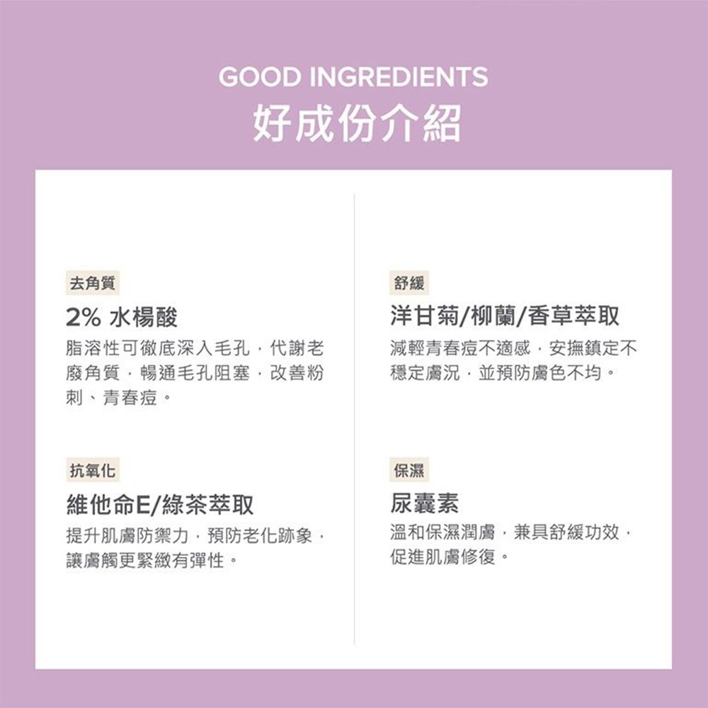 - 水楊酸溫和去除老廢角質,改善粗糙膚觸,展現絲滑柔嫩的觸感。
