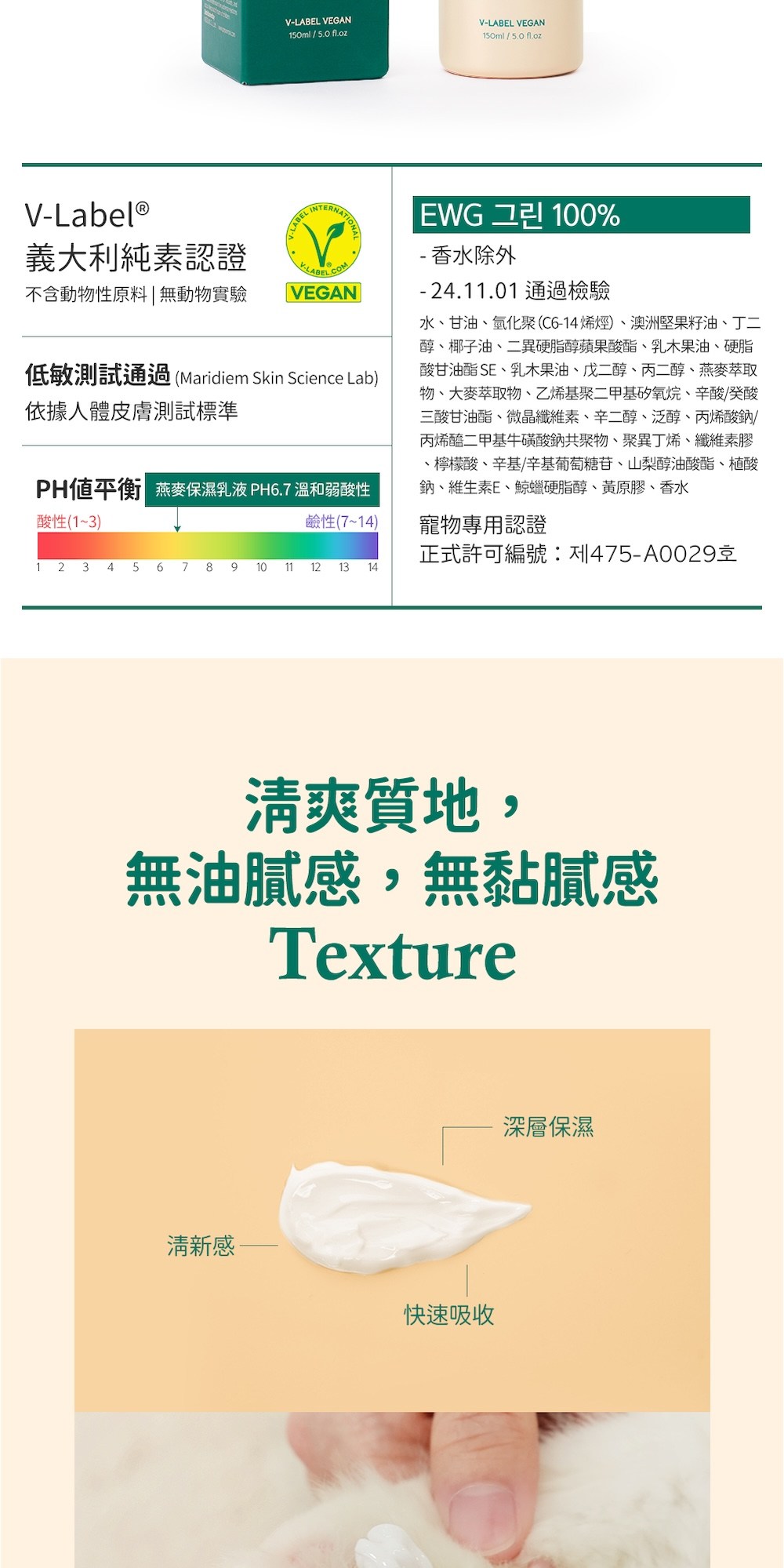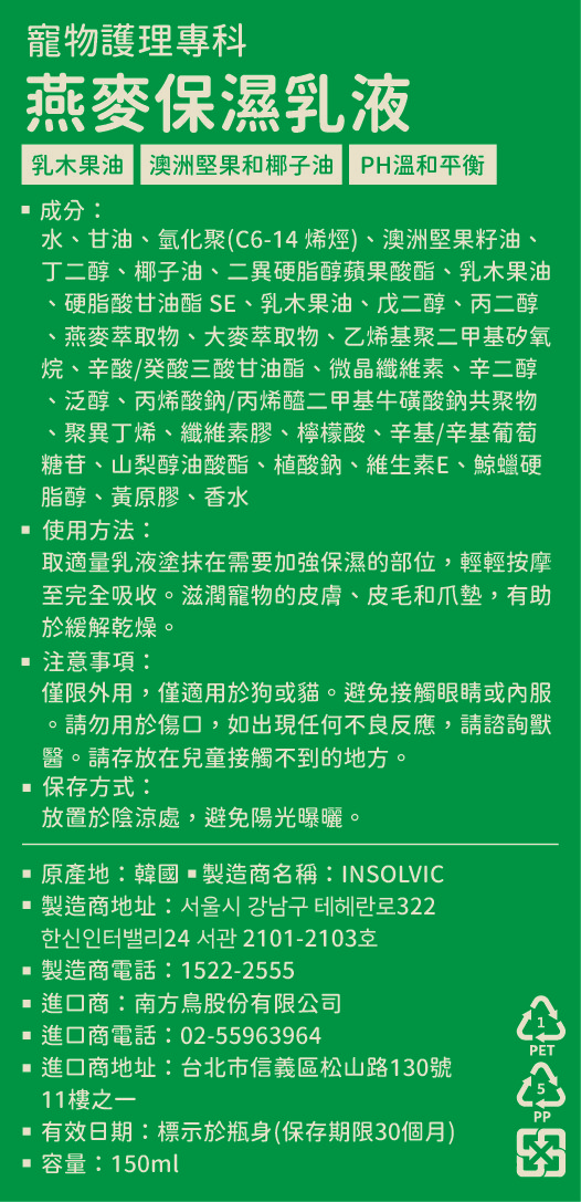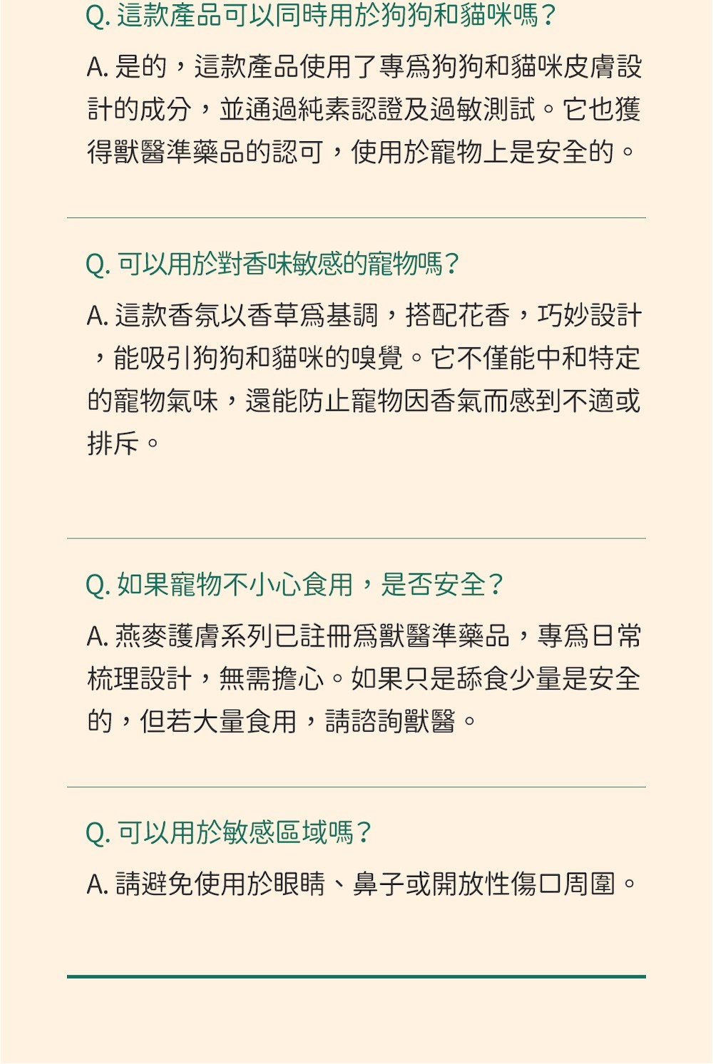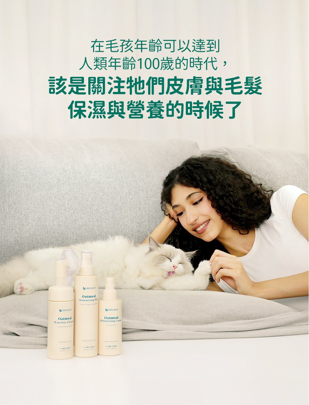 - 添加燕麥與乳木果油,能深層滋潤寵物乾燥的皮膚,讓毛髮恢復自然光澤與彈性。