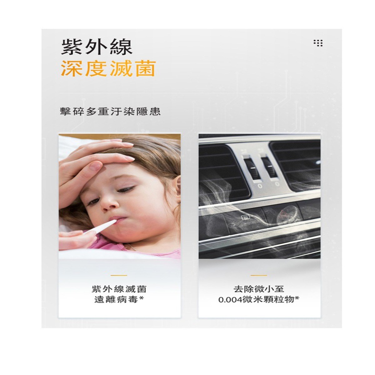 - 高效UVC除菌技術,迅速殺滅車內細菌,守護您的呼吸道健康。