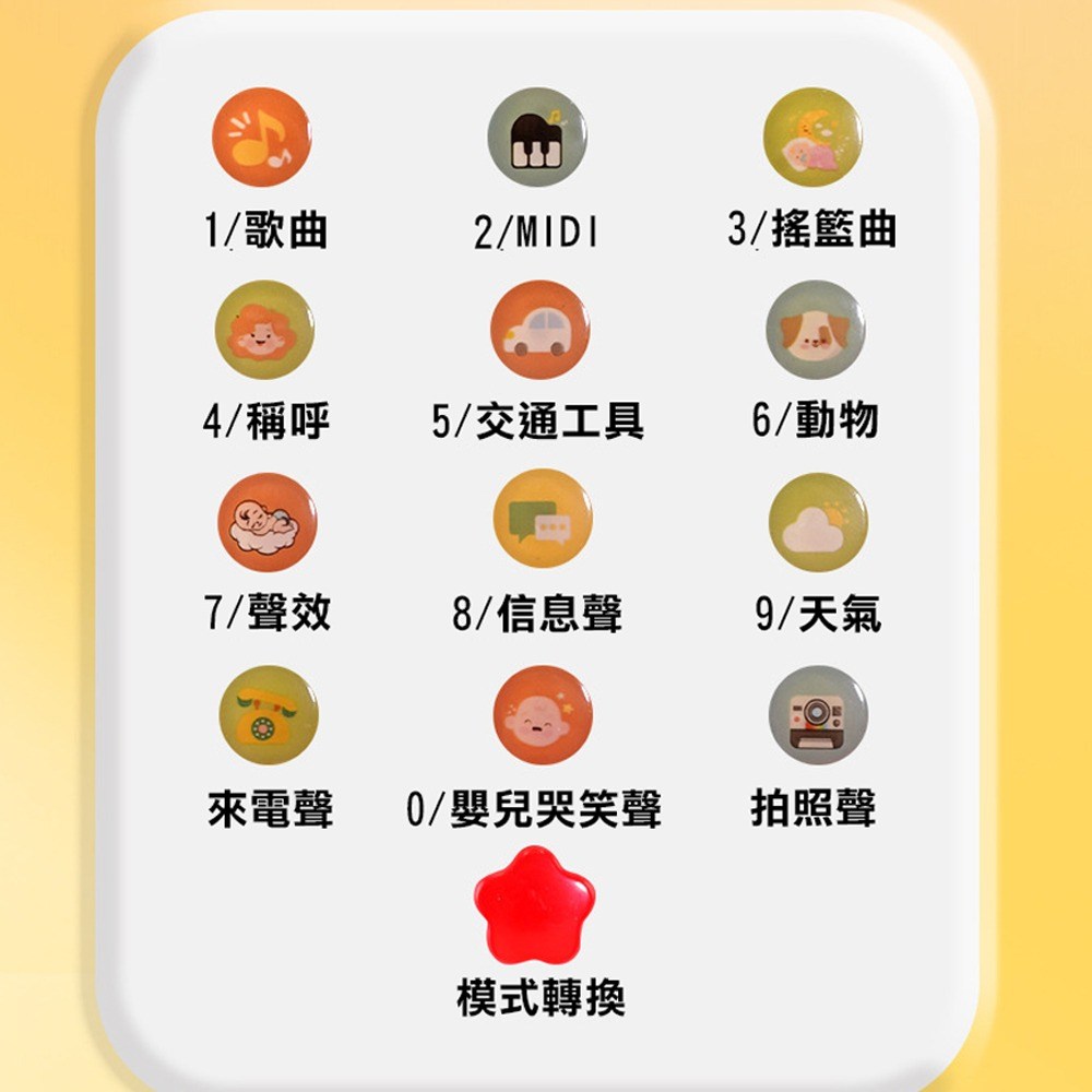 - 具備來電聲、音樂、動物叫聲等多種模式,讓寶寶在遊戲國中習,促進感官發展與探索。