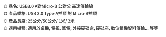 - A公對Micro B設計,適用多種設備,如手機、硬碟等,方便又實用。