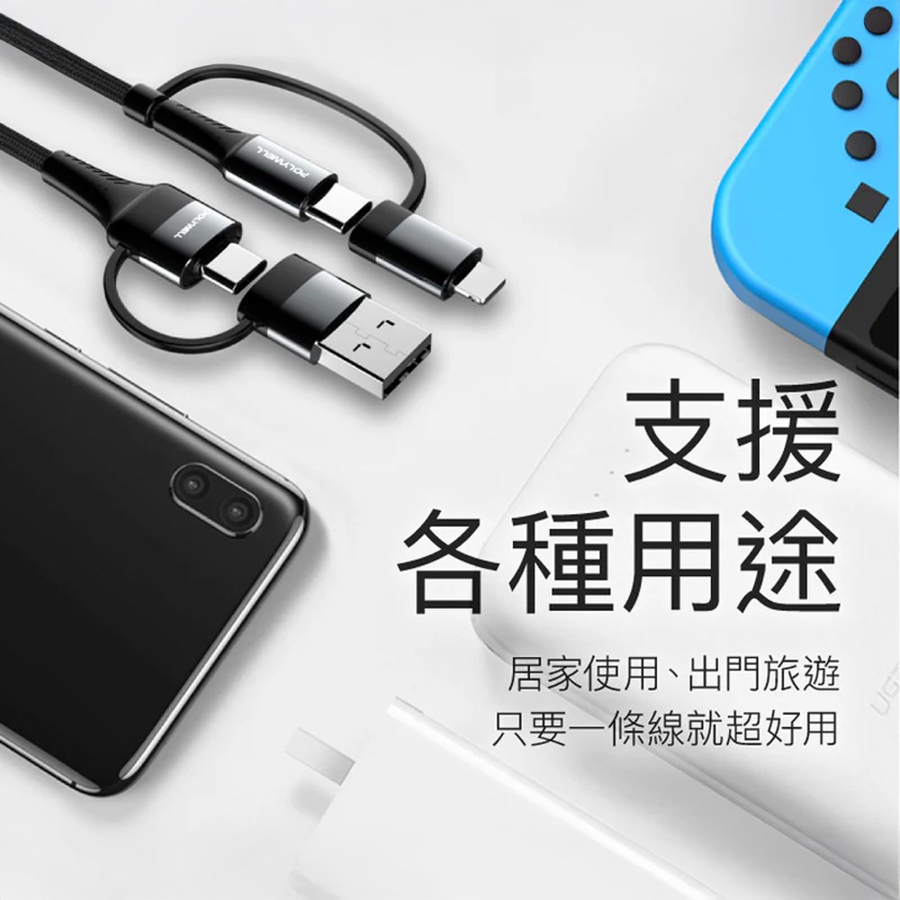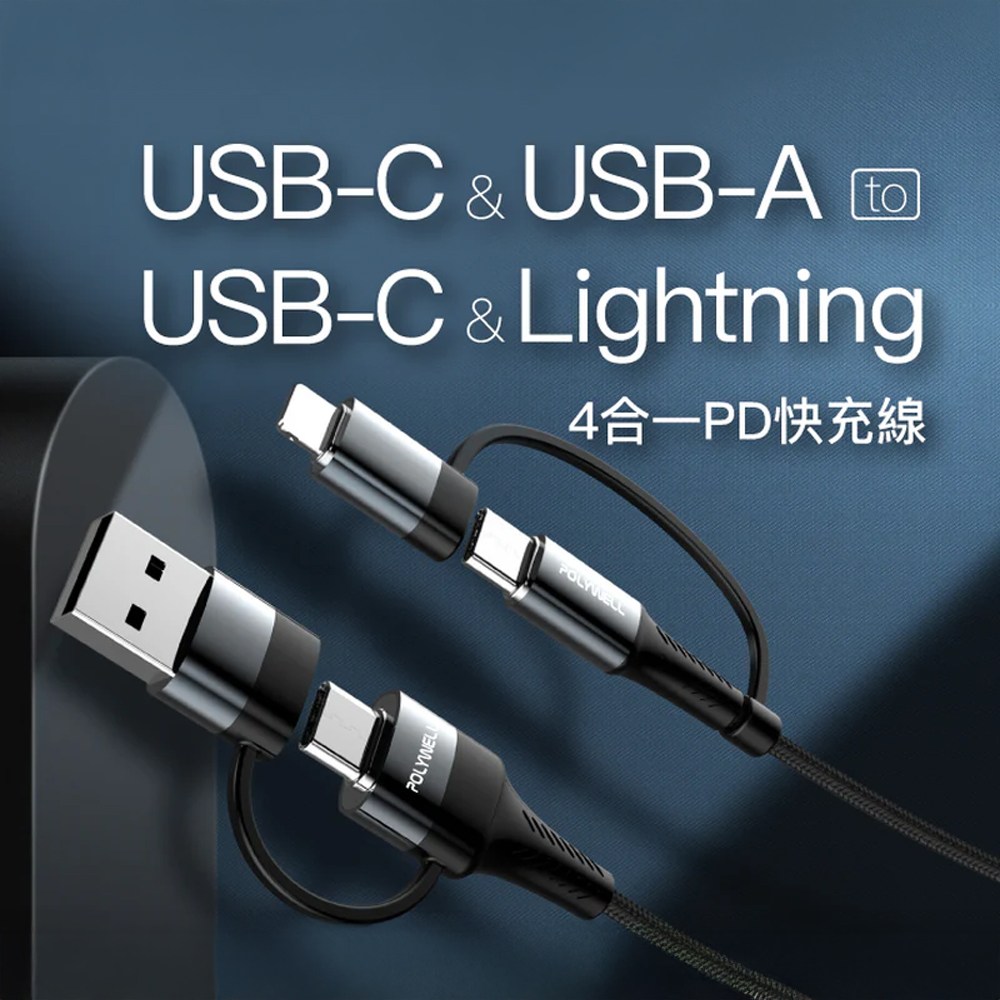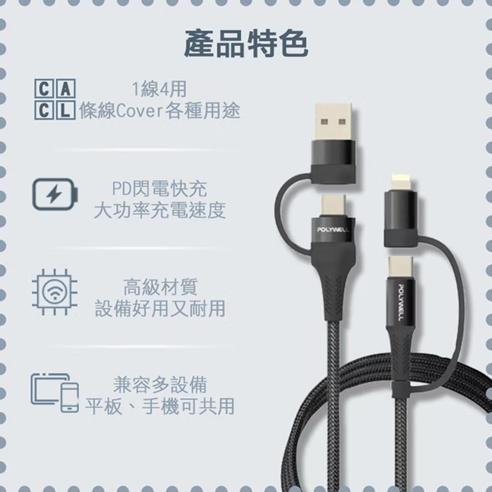 POLYWELL 四合一PD編織快充線是您解決多種設備充電需求的理想選擇。這款1米長的黑色充電線集USB-A、USB-C和Lightning接口於一身,讓您只需一條線即可為多種設備充電,告別攜帶多條充電線的煩惱。編織線身設計不僅堅固耐用,讓您使用更加方便。支持PD快充協議,提供高效率的充電速度,節省您的寶貴時間。無論是iPhone、Android手機還是平板電腦,POLYWELL 四合一充電線都能完美兼容,是居家、辦公和旅行的必備良品。