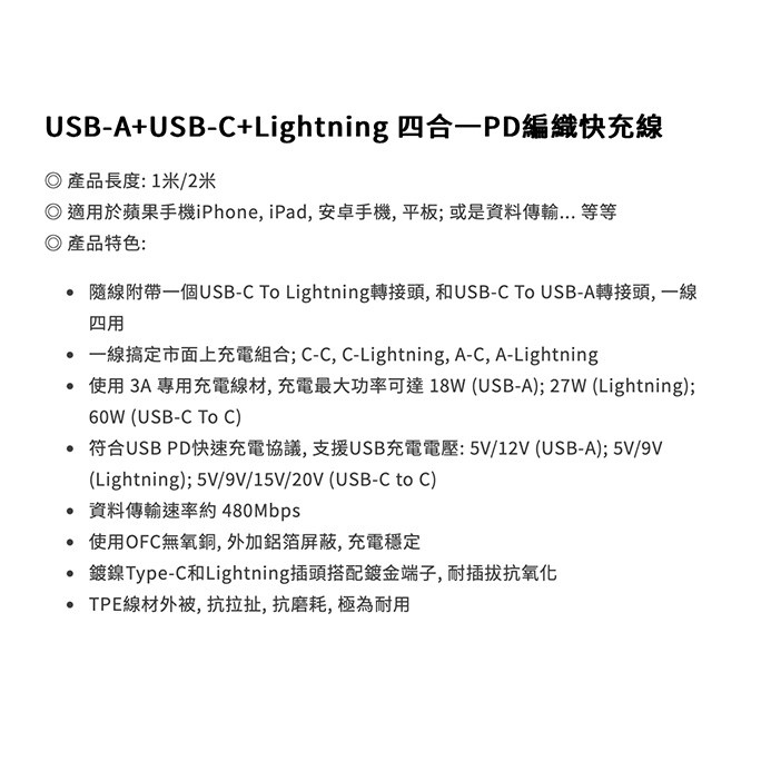 - 四合一設計讓您告別多線煩惱,輕鬆應對不同設備,享受便捷充電體驗。