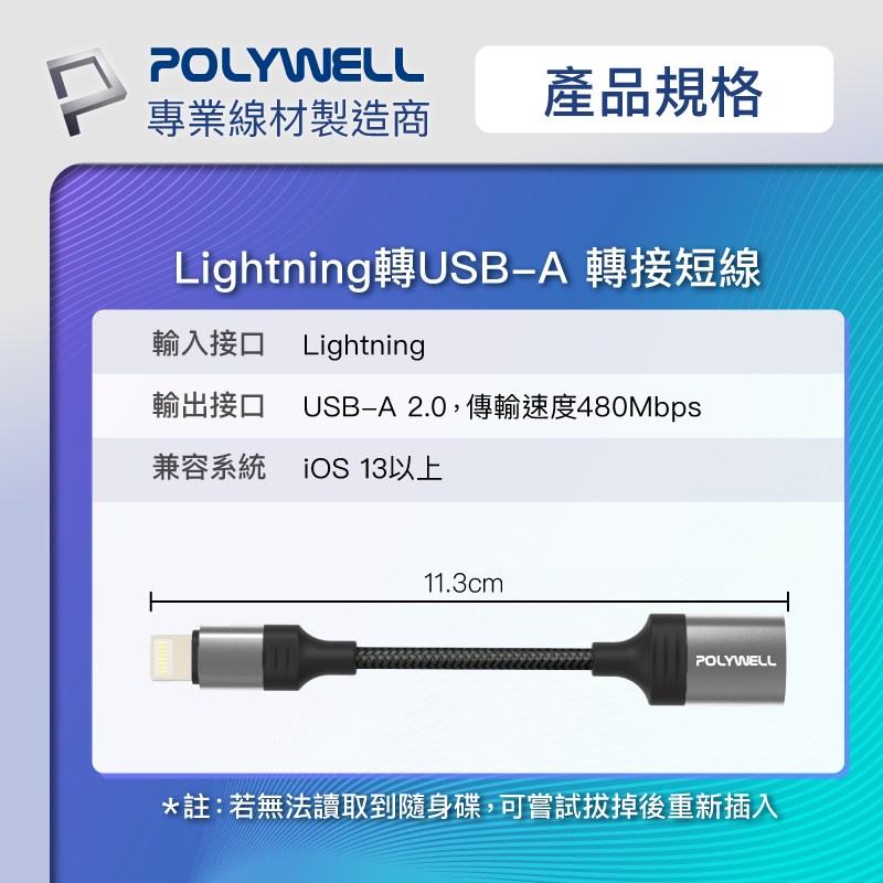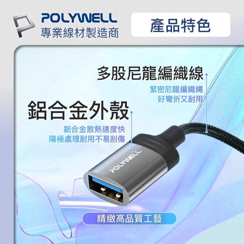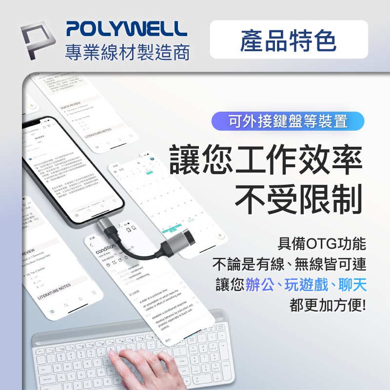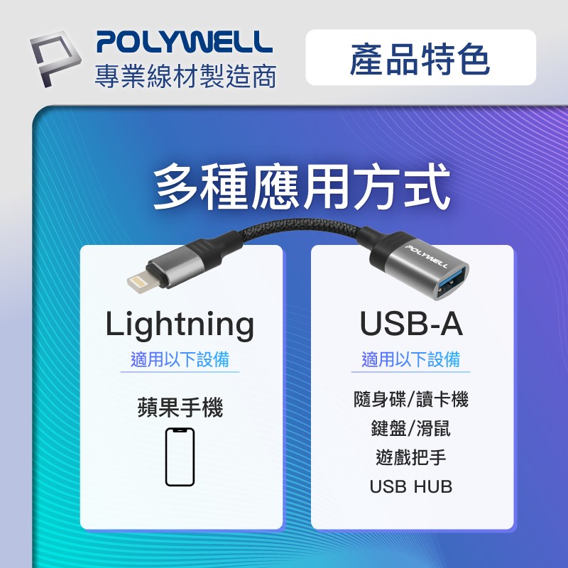 POLYWELL 蘋果OTG轉接線,讓您的iPhone連接無限可能!這款Lightning轉USB3.0-A轉接線,型號PW15-W45-A358,讓您輕鬆連接USB隨身碟、鍵盤、滑鼠等設備,擴展iPhone的功能。採用耐用的編織線和鋁合金外殼,不僅美觀,更提供良好的散熱和保護。無論是備份資料、連接鍵盤提高工作效率,還是連接遊戲手把享受遊戲樂趣,這款轉接線都能滿足您的需求。小巧的設計方便攜帶,隨時隨地擴展您的iPhone功能。