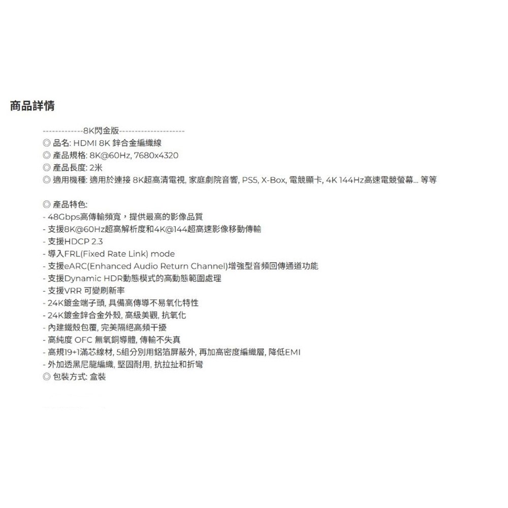 POLYWELL HDMI 8K鋅合金編織線,為您帶來極致的影音體驗。此線材支援8K@60Hz超高解析度,以及4K@144Hz高速影像傳輸,讓您在家也能享受劇院級的視覺效果。採用24K鍍金端子頭與鋅合金外殼,不僅外觀高級美觀,更具備優異的抗氧化能力,確保訊號傳輸穩定。高純度OFC無氧銅導體,搭配多層屏蔽設計,有效降低電磁干擾,提供清晰、無失真的影像品質。適用於連接8K超高清電視、家庭劇院音響、PS5、X-Box等設備,是您影音娛樂的最佳選擇。