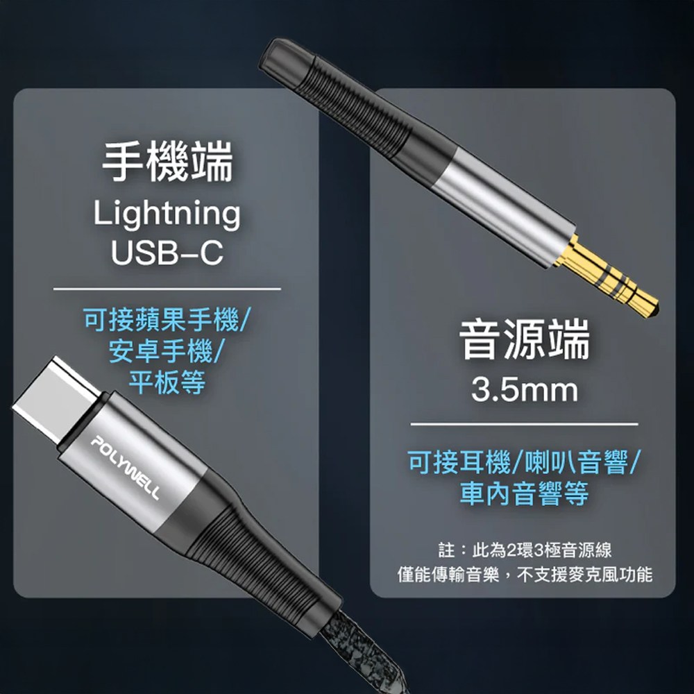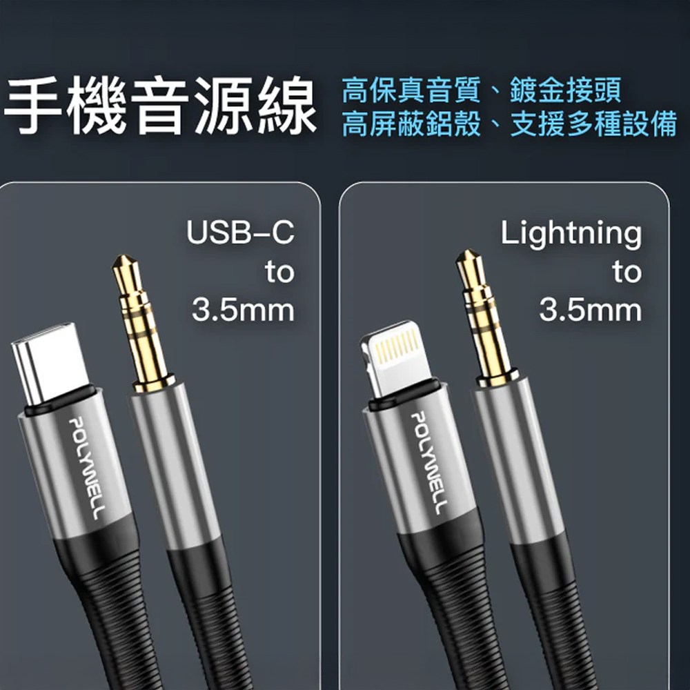 POLYWELL 音源轉接線,讓您的 iPhone 和安卓設備也能輕鬆連接 3.5mm 耳機或音響!這款 100 公分的 Lightning Type-C 轉 3.5mm 音源線,採用高品質材料,確保音源傳輸穩定無損,讓您享受清晰純淨的音樂體驗。無論是在車上、在家中,或是旅途中,都能隨時隨地享受音樂的樂趣。堅固耐用的設計,讓您不必擔心線材容易損壞,使用更長久。告別藍牙配對的麻煩,即插即用,簡單方便,讓您立即沉浸在音樂世界中。