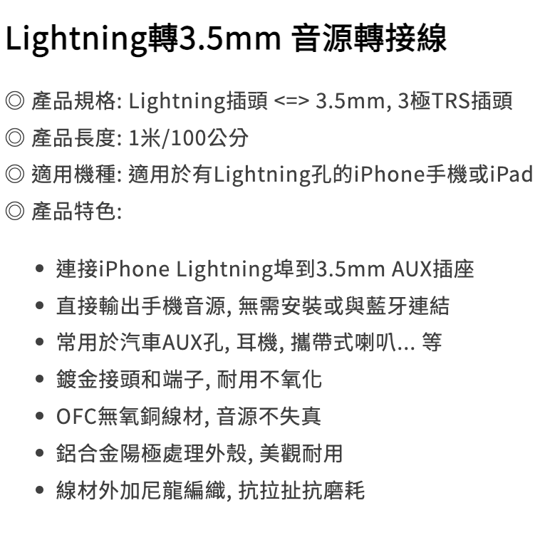 - 享受音樂無拘束,輕鬆連接您的iPhone至3.5mm音響設備,隨時隨地沉浸在音樂世界裡。