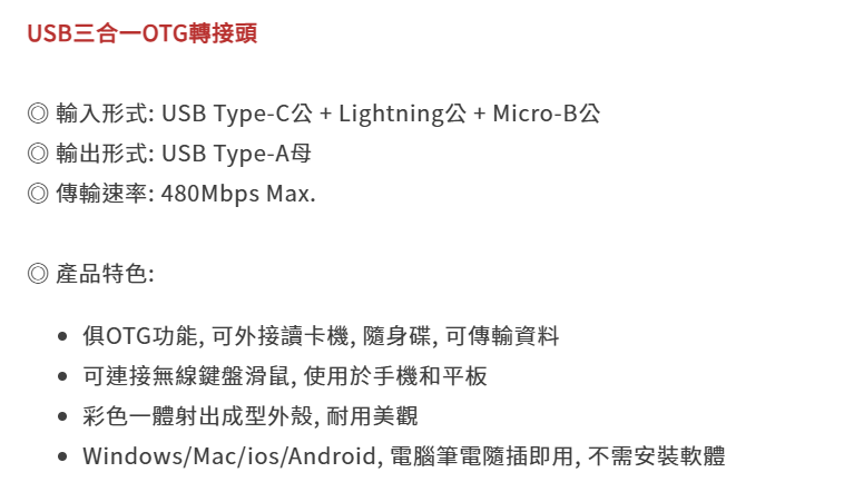 - 告別多線煩惱,這款三合一轉接頭讓您輕鬆應對不同設備,享受便捷的連接體驗。