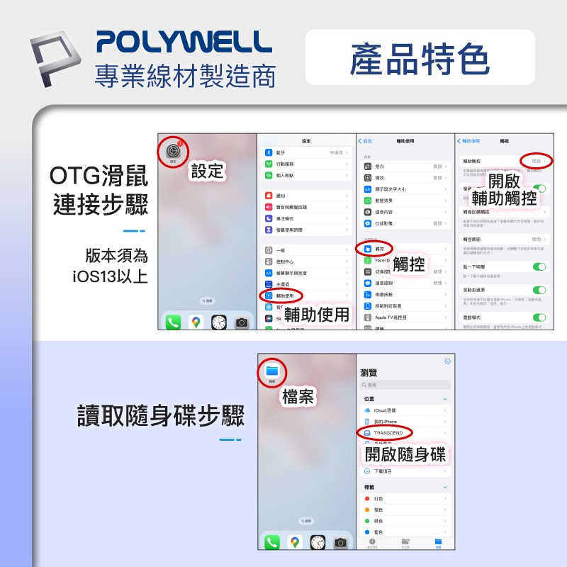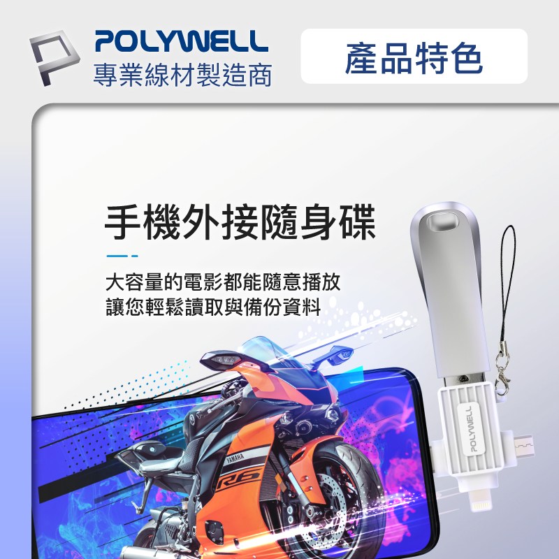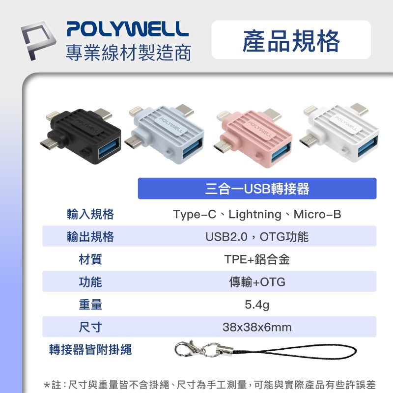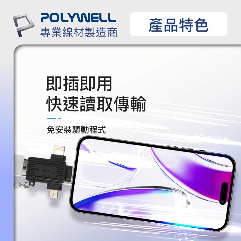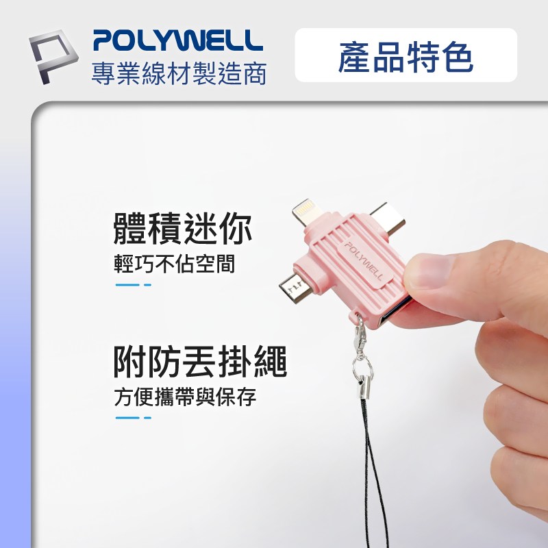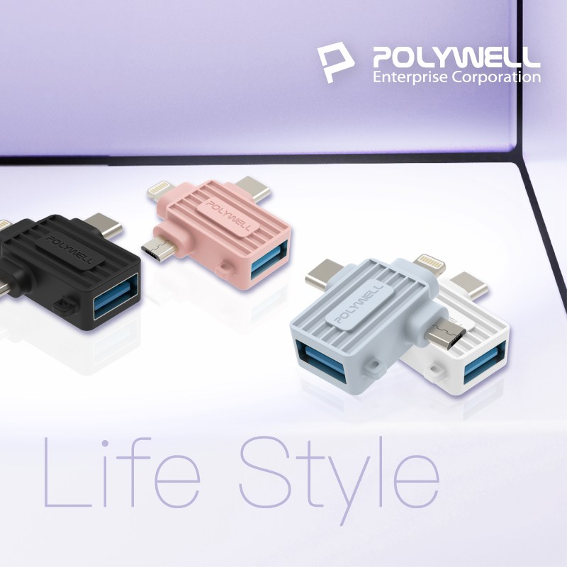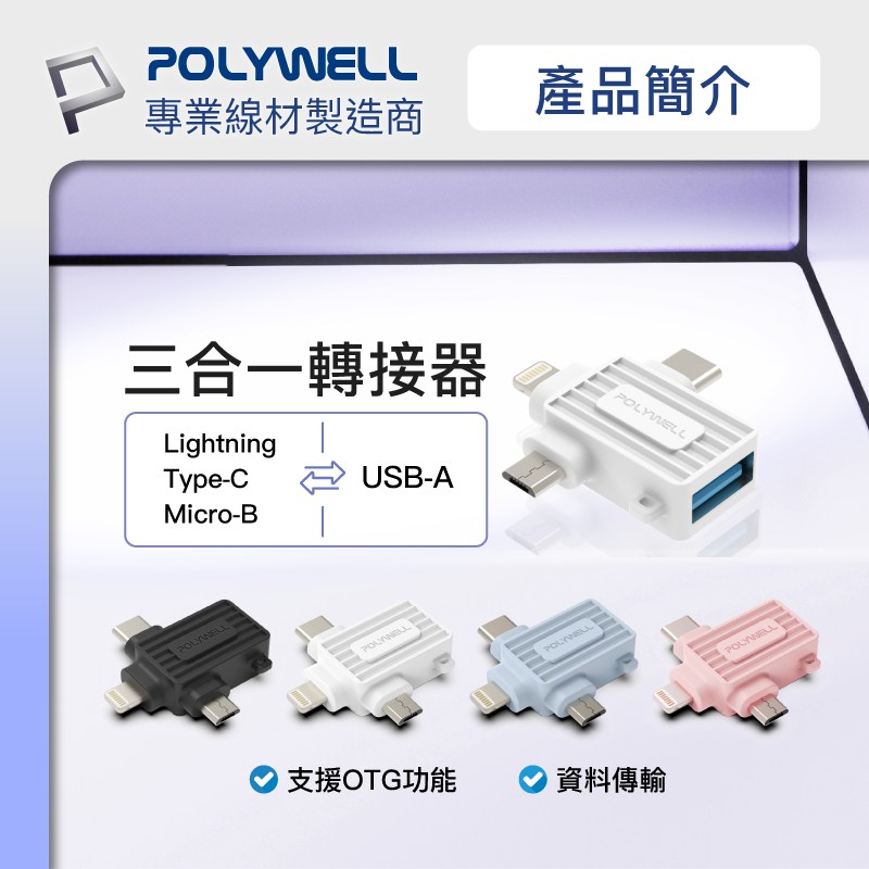 POLYWELL 三合一OTG轉接頭,讓您輕鬆連接各種設備!這款藍色轉接頭集Lightning、Type-C和Micro-B於一身,方便連接手機、平板電腦等設備到USB接口。無論是傳輸數據、連接鍵盤滑鼠,還是讀取隨身碟,它都能輕鬆應對。小巧設計,方便攜帶,隨時隨地擴展您的設備功能。即插即用,無需安裝任何驅動程式,簡單又方便。讓您的生活更加便捷!