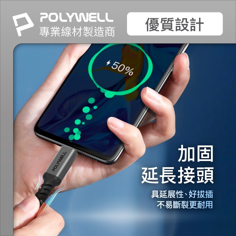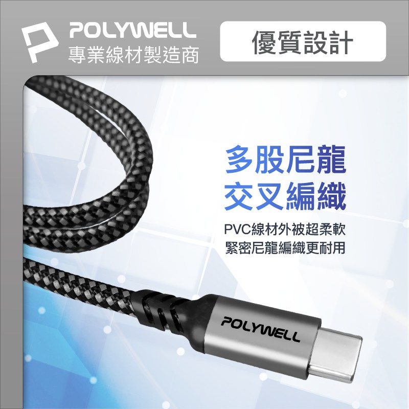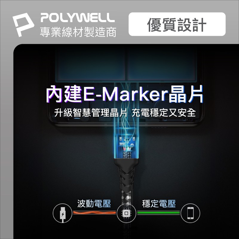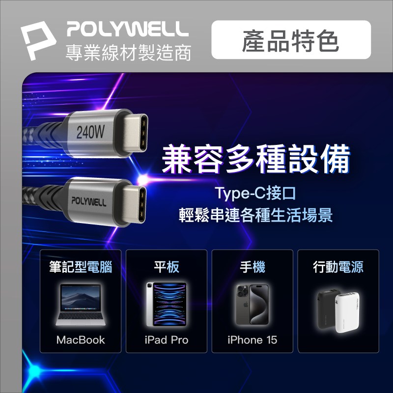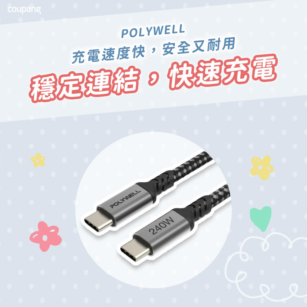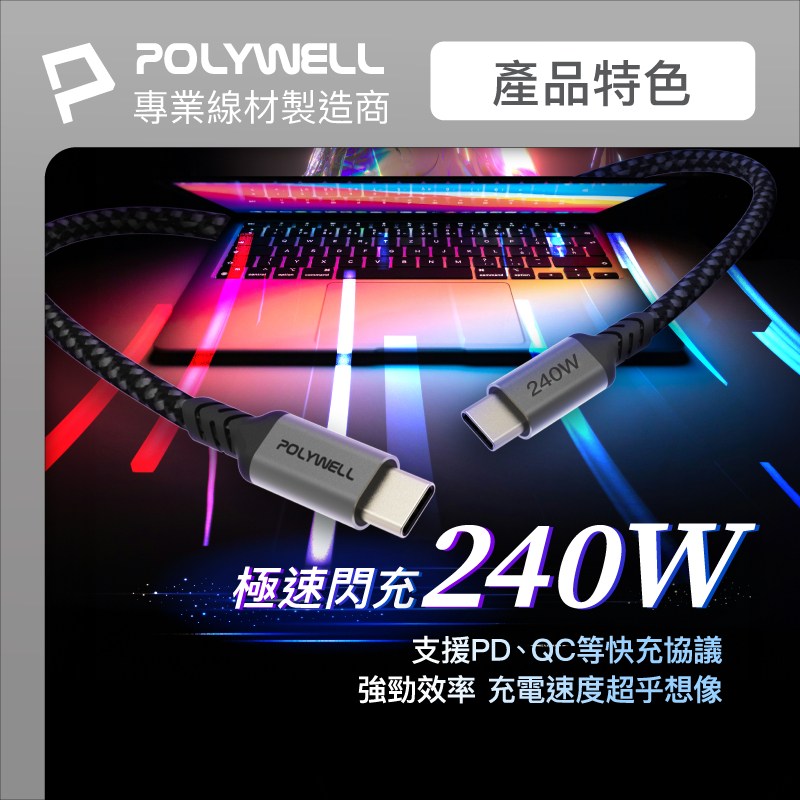 POLYWELL 寶利威爾 USB Type-C 240W 5A 快充編織線,採用長尾設計,長度為1米,是您快速充電的理想選擇。這款編織線支援高達240W的功率,確保您的手機、平板電腦和筆記型電腦都能以最快的速度充電。Type-C接頭設計,適用於各種通用設備,讓您輕鬆應對不同的充電需求。高密度尼龍編織外層不僅耐用,延長使用壽命。內建E-Marker晶片,提供穩定的電壓,確保充電過程安全可靠,讓您安心使用。
