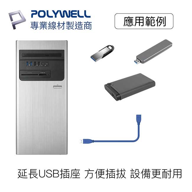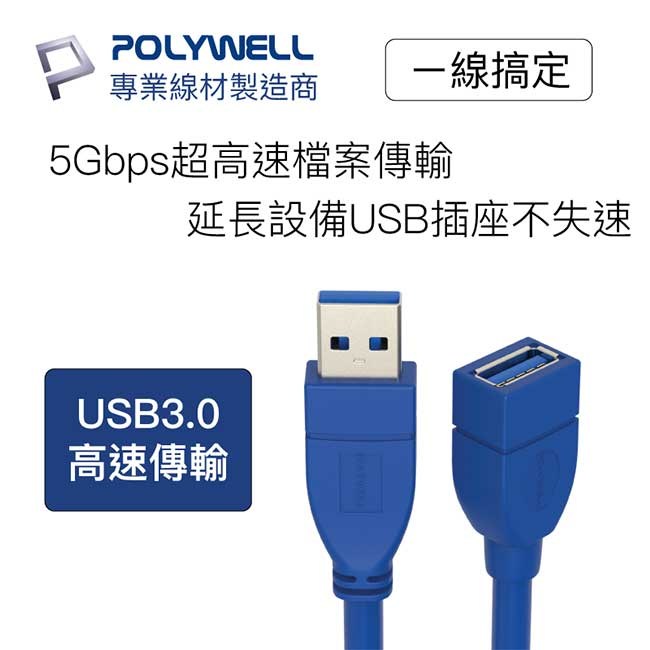 POLYWELL USB3.0 A公 To A母延長線,讓您輕鬆擴展USB連接距離,解決設備連接的困擾。這款3公尺長的黑色延長線,採用USB 3.0技術,提供高達5Gbps的超高速數據傳輸,確保文件傳輸不失速,提升工作效率。線材內部採用高密度編織和鋁箔屏蔽,有效減少信號干擾,保證數據傳輸的穩定性。加粗線徑21AWG,降低電阻,提供更穩定的電力傳輸,支援5V/9V/12V快充電壓,最大功率可達18W,讓您的設備充電更快速。適用於桌機、電視、筆電、汽車等,方便連接隨身碟、硬碟等設備,延長USB插座,方便插拔,設備更耐用。