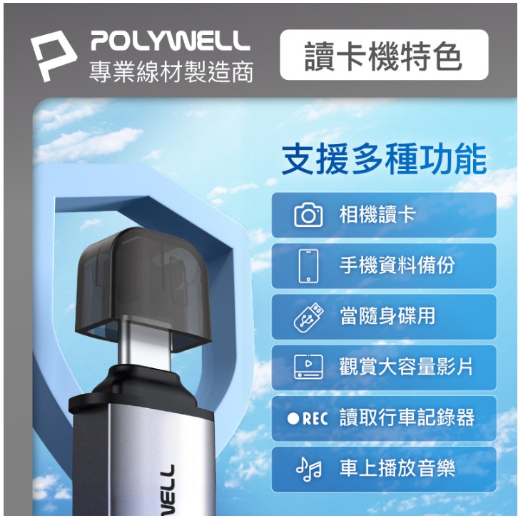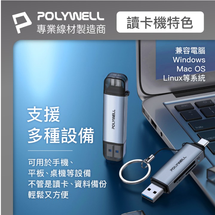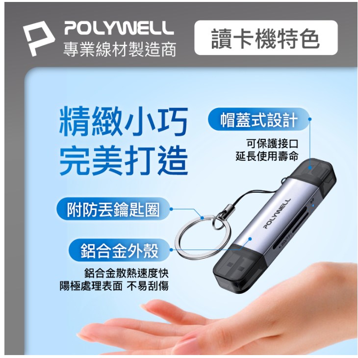 - 輕巧便攜設計,POLYWELL讀卡機體積小巧,方便您隨身攜帶,隨時隨地讀取資料。