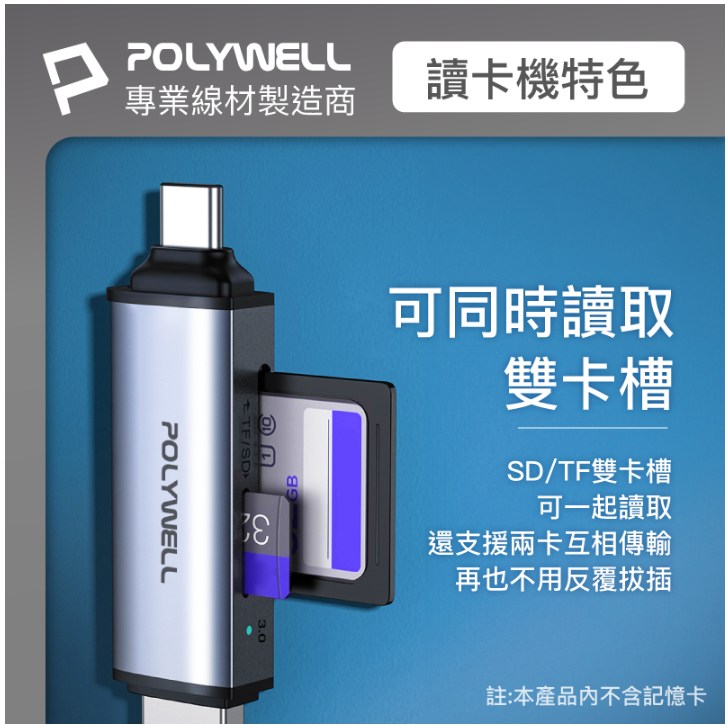 - 雙卡槽設計,POLYWELL讀卡機讓您同時讀取SD和TF卡,省去頻繁更換的麻煩。
