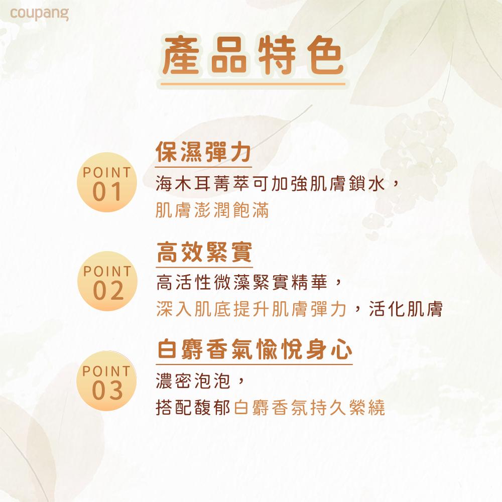 - 澎澎香浴乳,細緻泡沫溫柔包覆肌膚,洗後肌膚水嫩不乾澀,享受沐浴後的柔滑觸感。
