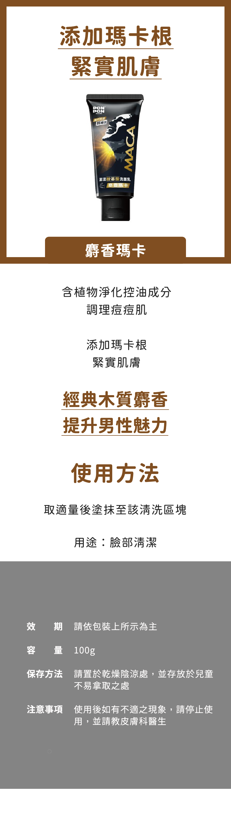 - 獨特麝香瑪卡配方,散發迷人木質香氣,洗臉同時享受香氛,提升個人魅力與自信。