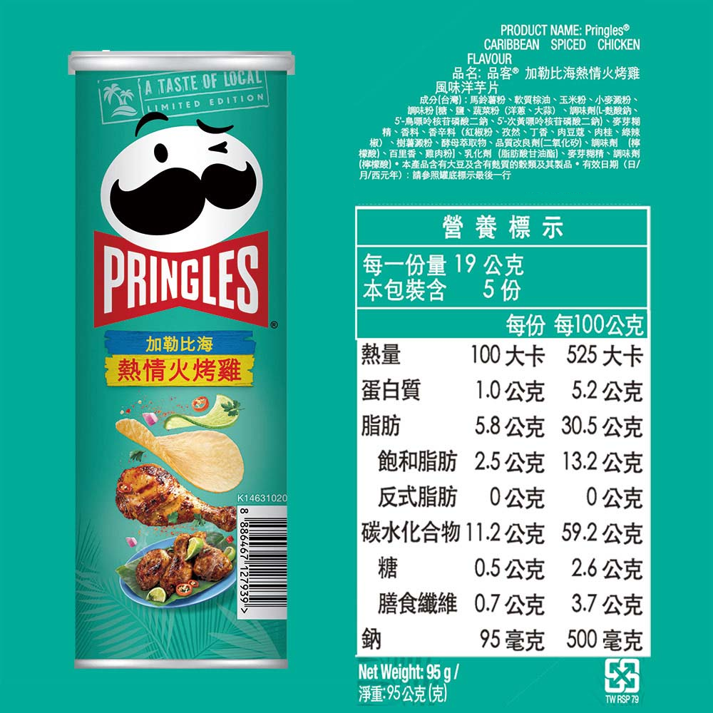 - 品客洋芋片獨特香脆口感,搭配加勒比海熱情火烤雞風味,令人回味無窮。