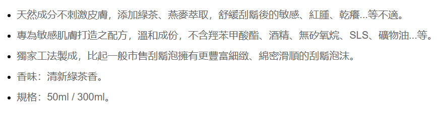 - 清新綠茶香氛,帶來愉悅的刮鬍體驗,讓您在刮鬍的同時,享受清新的氣息。