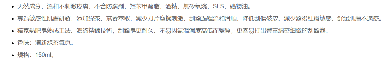 - 蘊含燕麥和綠茶萃取,提供額外的保濕和舒緩效果,讓刮鬍後的肌膚水潤不緊繃。