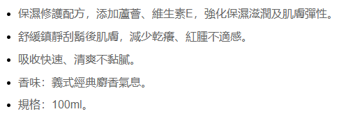 義大利 Proraso 義式麝香鬍後乳,藍標,是您刮鬍後的最佳選擇。這款100ml的鬍後乳,能有效舒緩刮鬍後的不適,減少乾燥和紅腫,讓肌膚恢復活力。其保濕修護配方,添加蘆薈和維生素E,能強化保濕滋潤,提升肌膚彈性。清爽不黏膩的質地,能快速吸收,帶來舒適感受。經典義式麝香氣息,散發成熟男人的魅力。